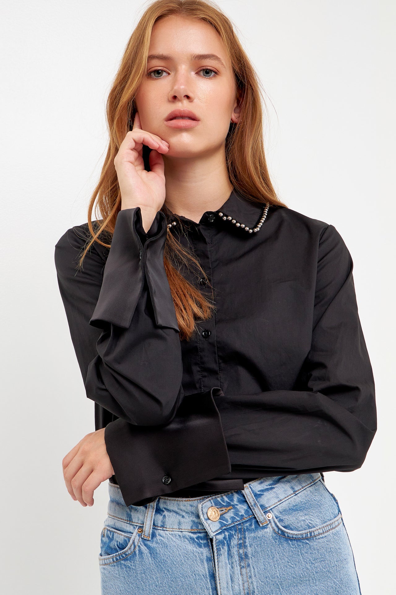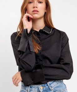 Elevate your style with this must-have beaded poplin shirt. Made from 100% pure cotton, this lustrous shirt features elegant gunmetal beading that gives it a touch of glamor. With long sleeves and a hidden placket, it’s perfect for dressing up or down. Add this chic piece to your wardrobe and wear it all season long. Whether you’re going out for dinner or hitting the office, this will be your go-to shirt.