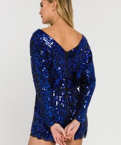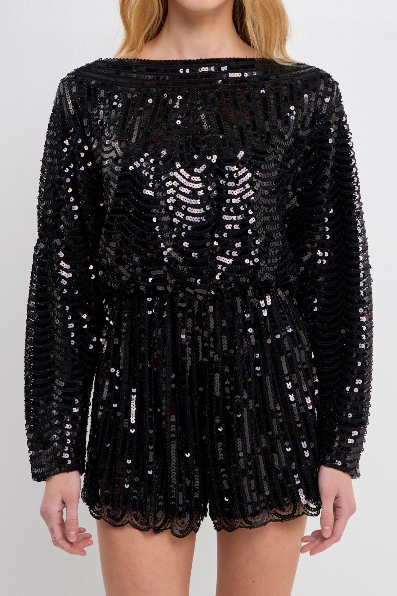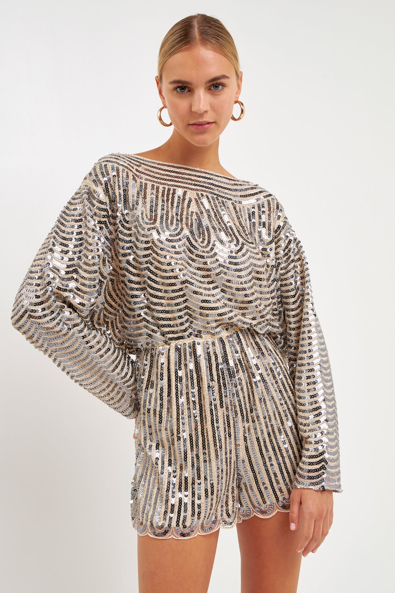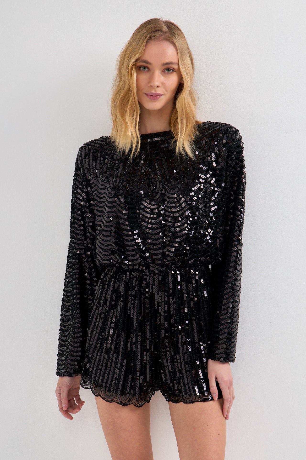 This glamorous Boat Neck Sequin Romper is the ideal party-ready piece. It features all-over sequin and bead embellishments for maximum sparkle. The boat neck is complemented with elastic band at the waist and long sleeves. With its luxury detailing this is the perfect glitzy addition to any woman’s wardrobe.