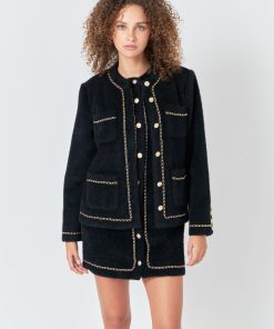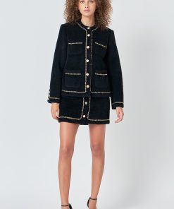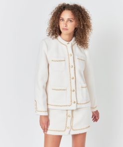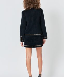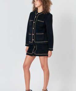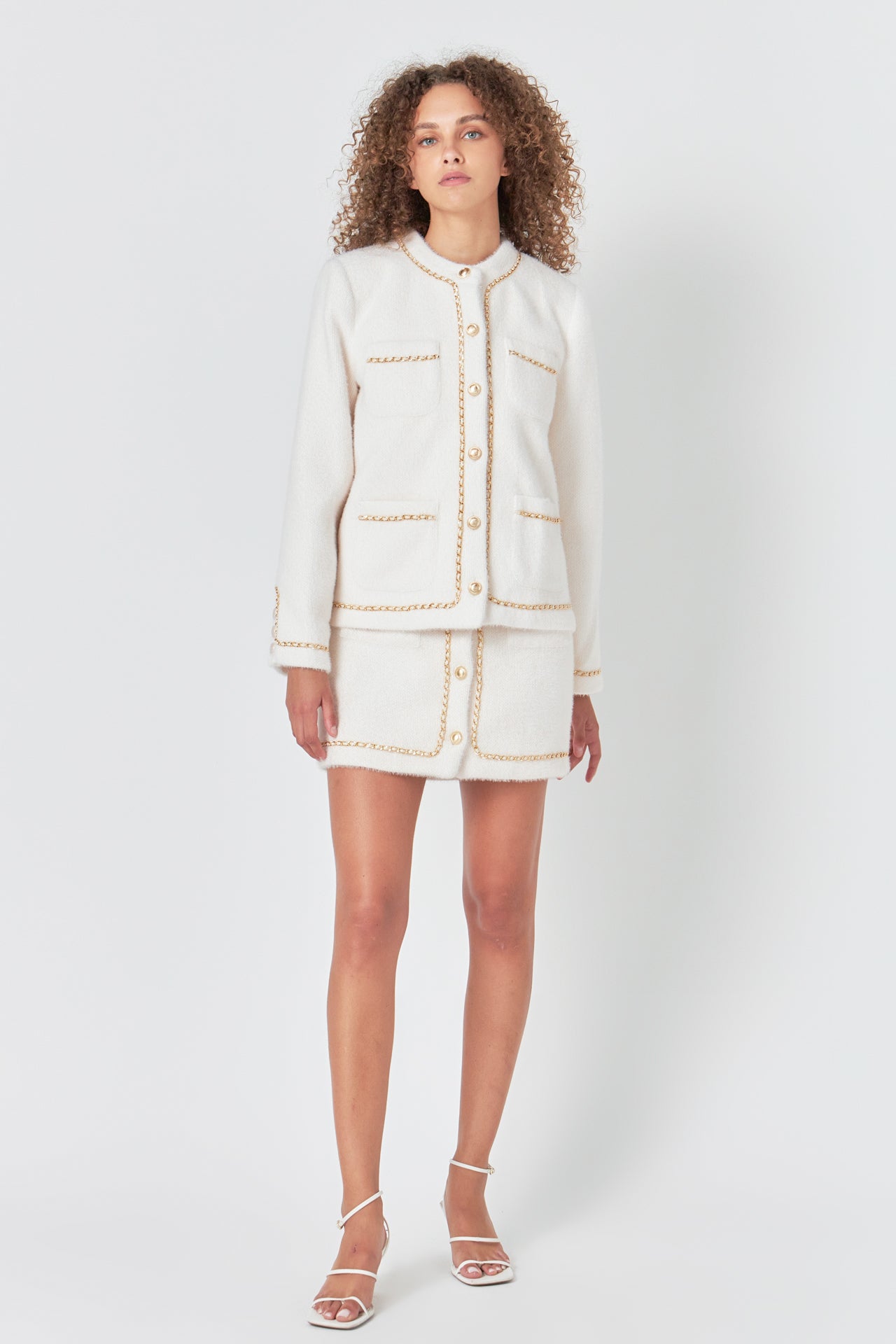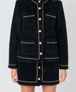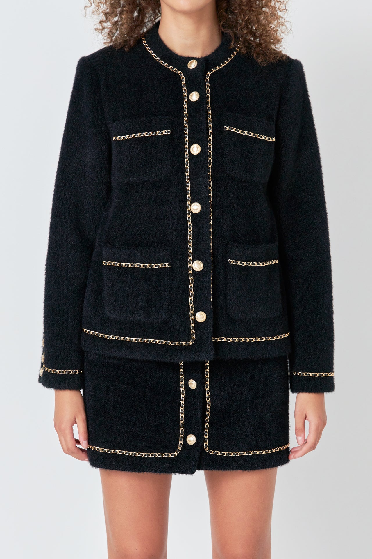 Be the centre of attraction with our stylish Chain Trimmed Jacket! This fashionable jacket is made from a fuzzy texture fabric and features a regular fit with a round neckline. The long sleeves add to the overall look while the golden chain trim lends a classy touch. Perfect for any season and occasion this jacket is sure to set you apart from the rest. Get ready to make an impression with our fashionable and stylish Chain Trimmed Jacket.