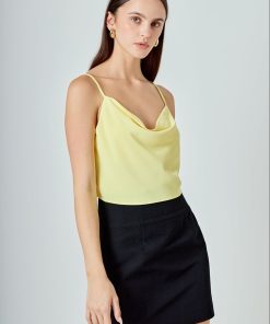 A cropped camisole with adjustable spaghetti straps and a cowl neck.