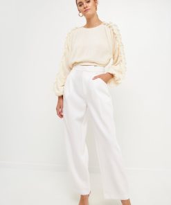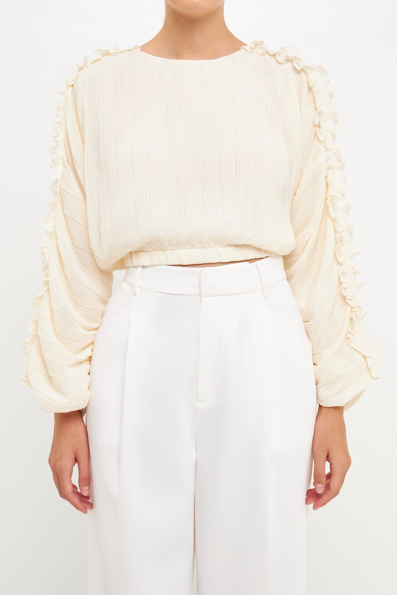 This cropped blouse is made with a sheer plisse fabric and features ruffle detailing on the sleeves. The elastic waistband provides a comfortable fit.