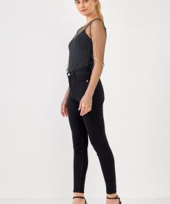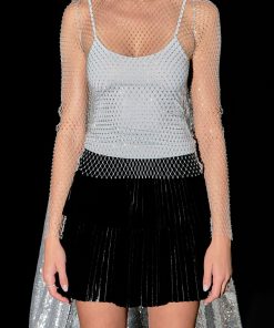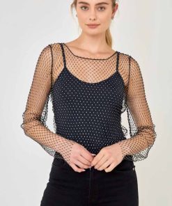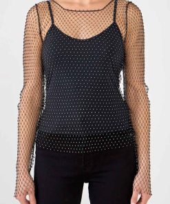 This beautiful top is made from a crystal-embellished mesh fabric. It comes with an ultra-soft and stretchy cami that has adjustable straps to make sure it fits you like a glove. This style is like getting two tops in one because you can wear the cami by itself with a comfortable lounge outfit. If you want, you can wear the mesh top over a lace bodysuit to give it a different look.