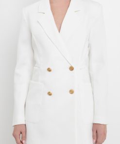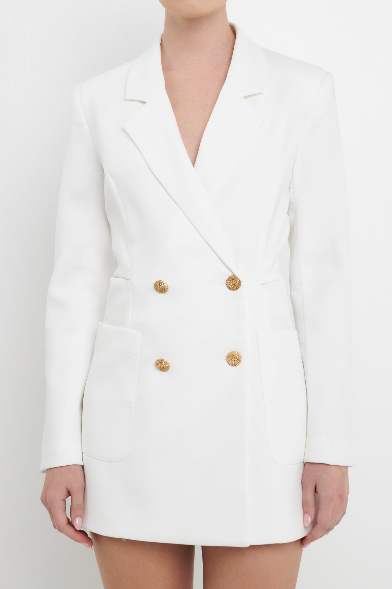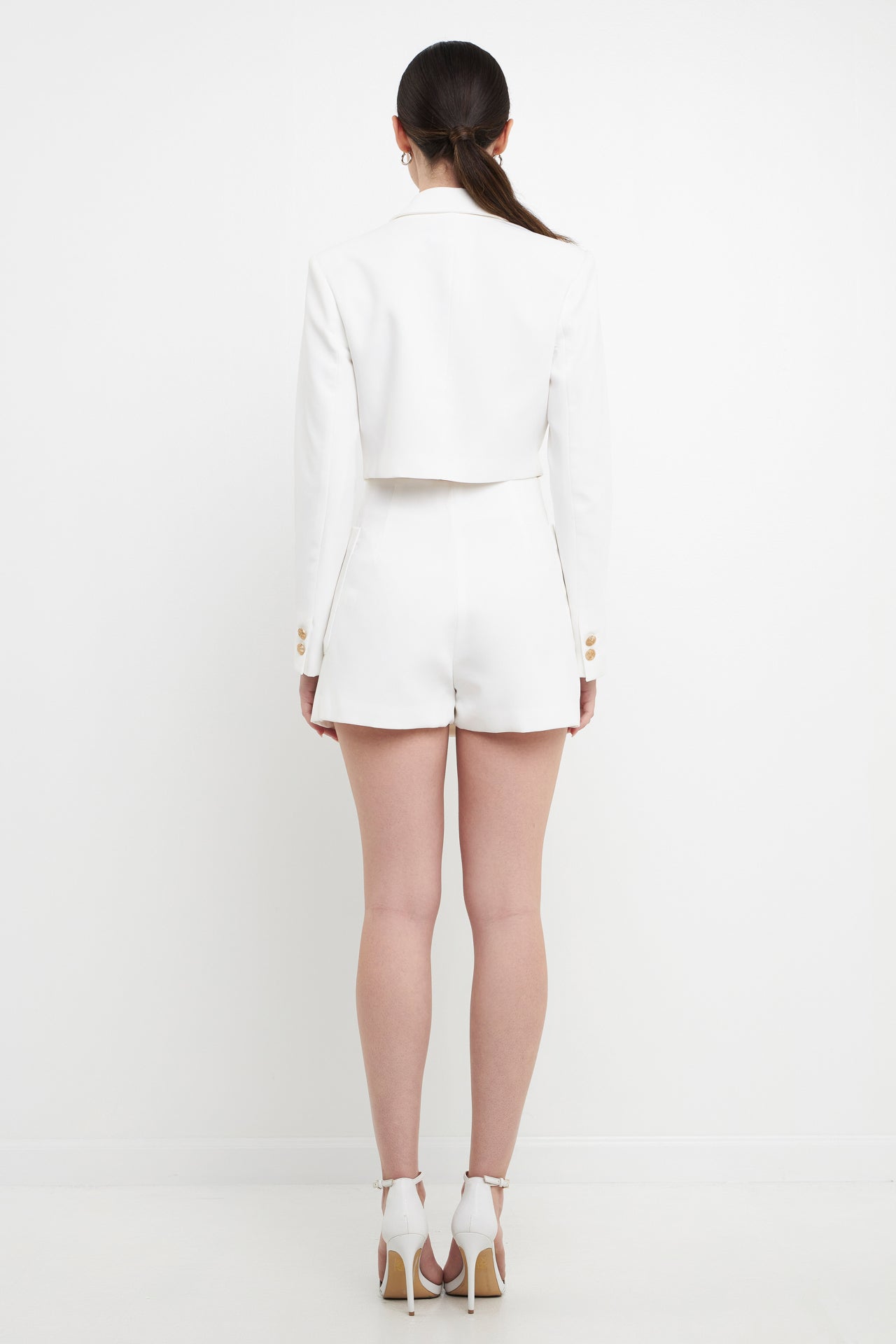 This Cutout Blazer Romper features a unique back cutout and stylish gold buttons. Cues are taken from a classic blazer silhouette, including a double-breasted style, shoulder pads, and a notch lapel. This blazer combines structure and femininity and can be worn at the office or while out with friends. The concealed zipper on the shorts makes sure they fit properly, while the lining throughout creates a comfortable piece.