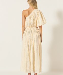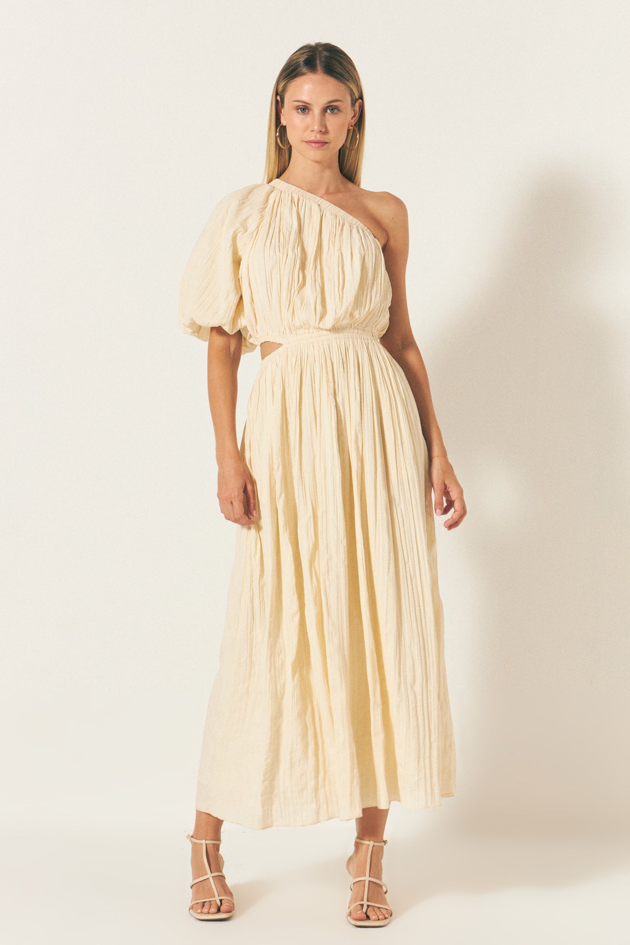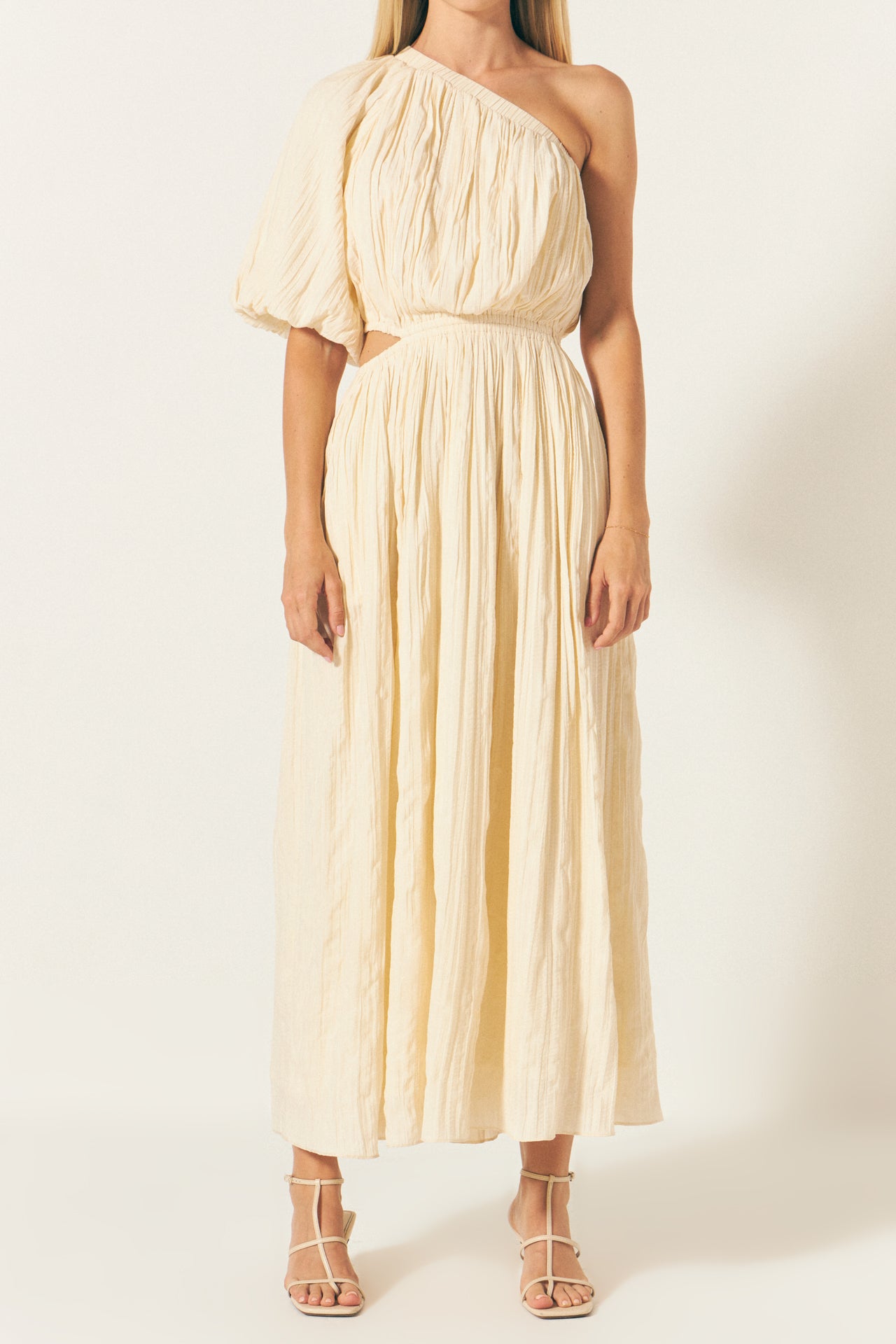 Introducing our stunning Asymmetrical Cut Out Dress perfect for any fashion-forward woman! This dress features a chic one shoulder design with a puffed short sleeve for a touch of elegance. The asymmetrical cut adds a trendy twist to this classic dress while the waist elastic band creates a flattering silhouette. Made with high-quality fabric for ultimate comfort and style. Make a statement at any event with this versatile and unique dress. Don’t wait add it to your wardrobe today!