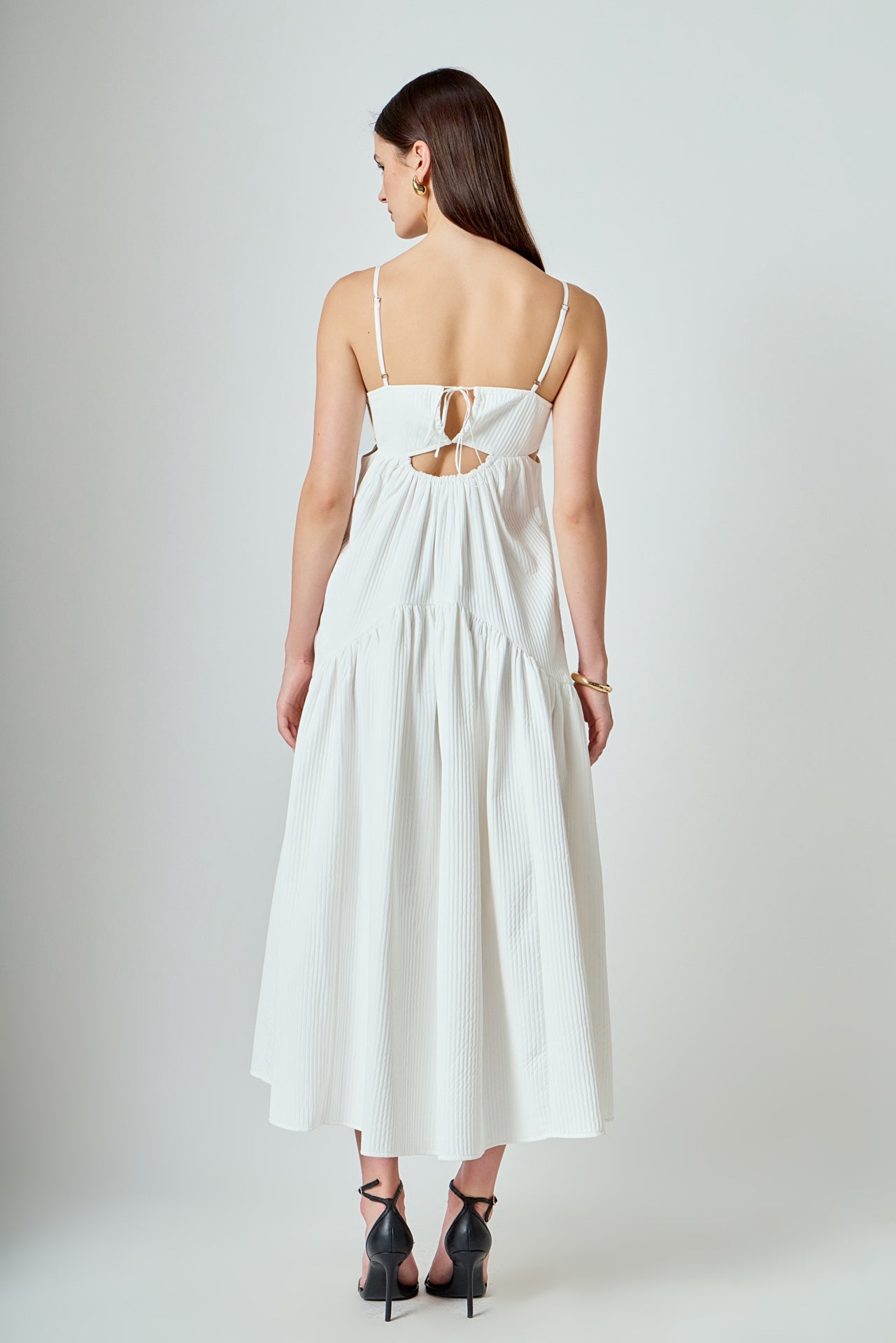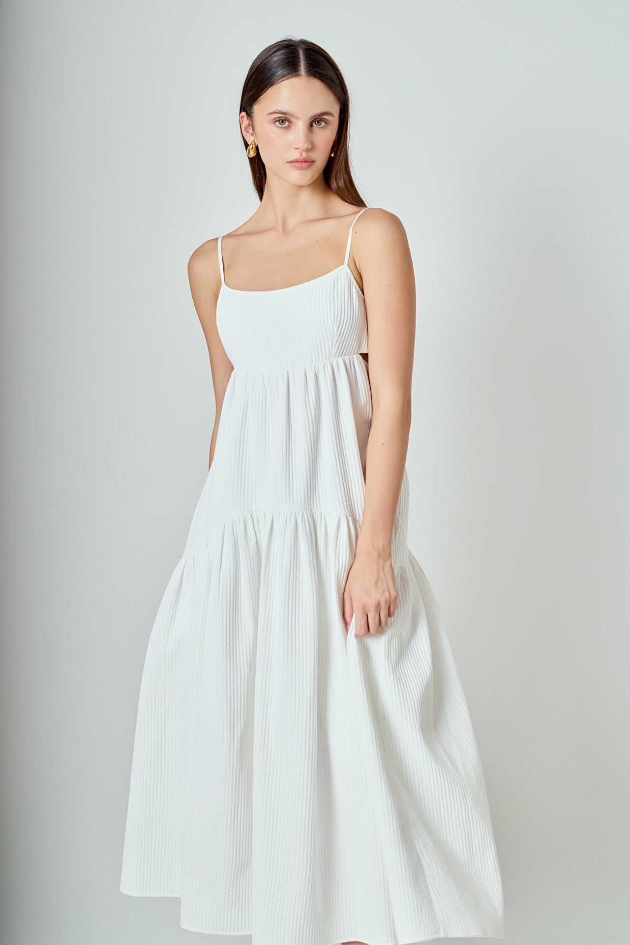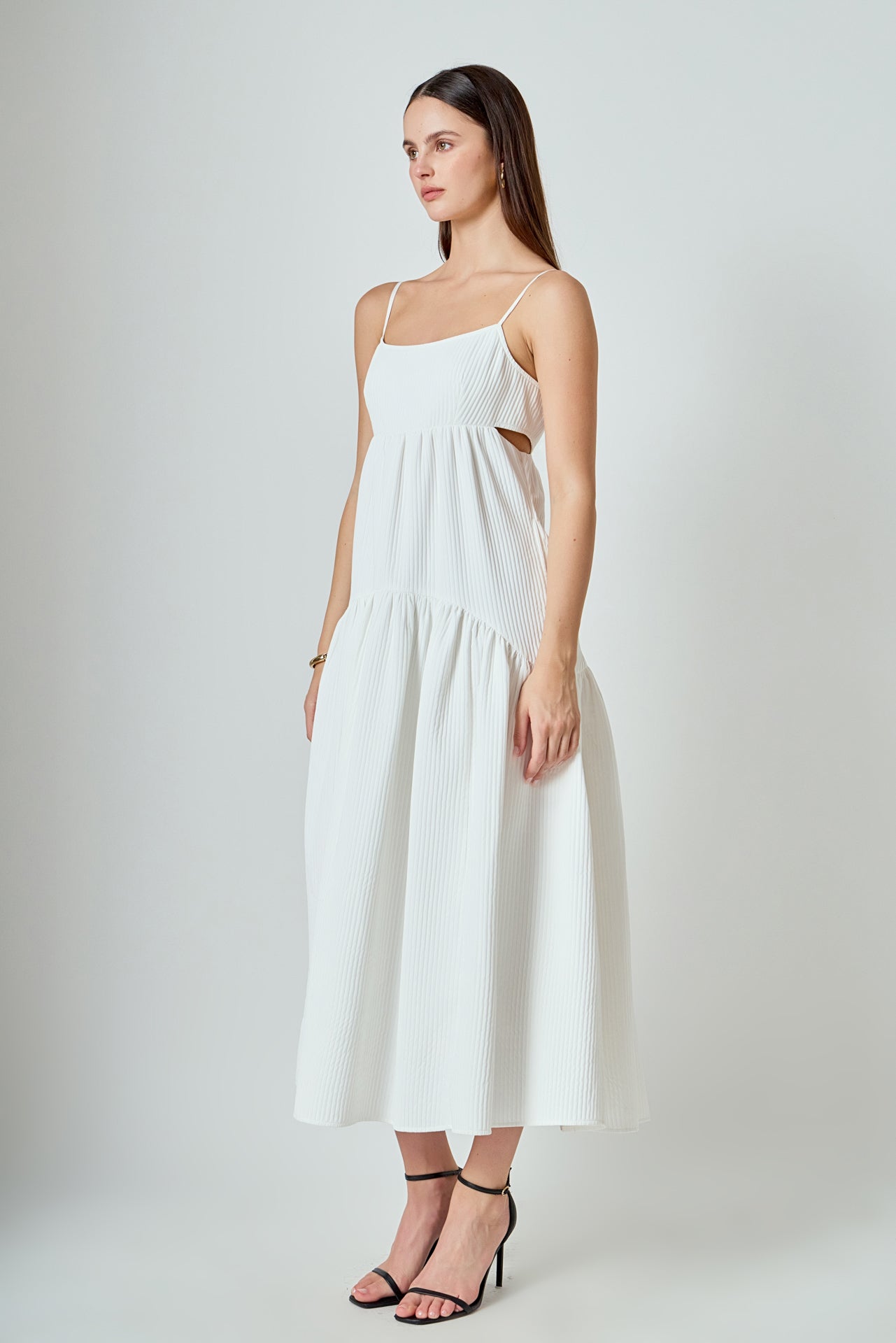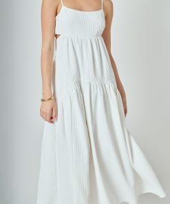 Elevate your style with our Evelyn Sleeveless Textured Cutout Maxi Dress, the perfect combination of comfort and elegance. Our dress features a maxi length that creates a flattering silhouette, while the textured fabric adds a touch of sophistication. The sleeveless design is perfect for warmer weather, and the strategically placed cutouts add a hint of sexiness. Made with quality material, this dress is perfect for any occasion. Upgrade your wardrobe with this must-have dress and make a statement wherever you go. Shop now and embrace style and comfort with our Textured Maxi Dress.