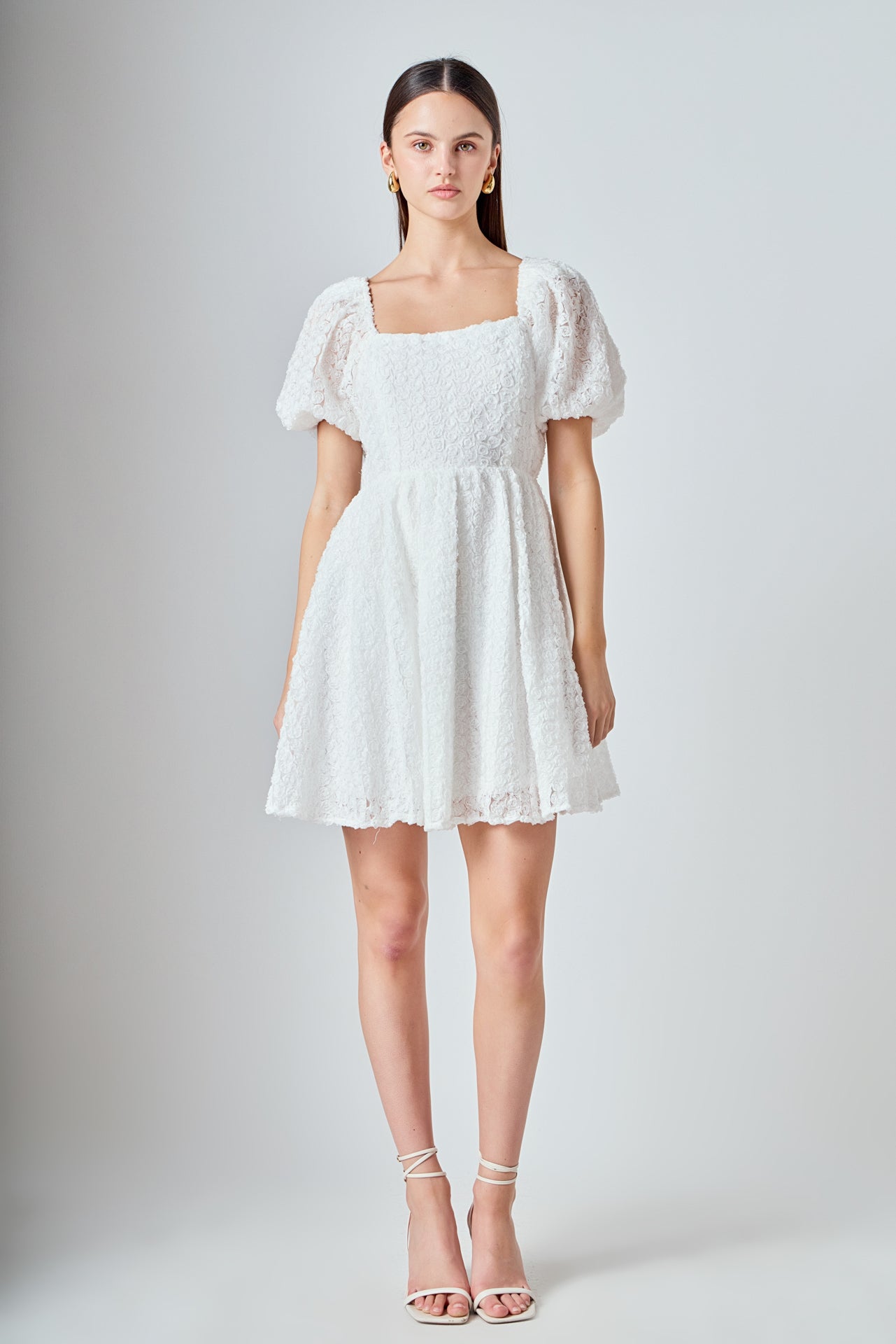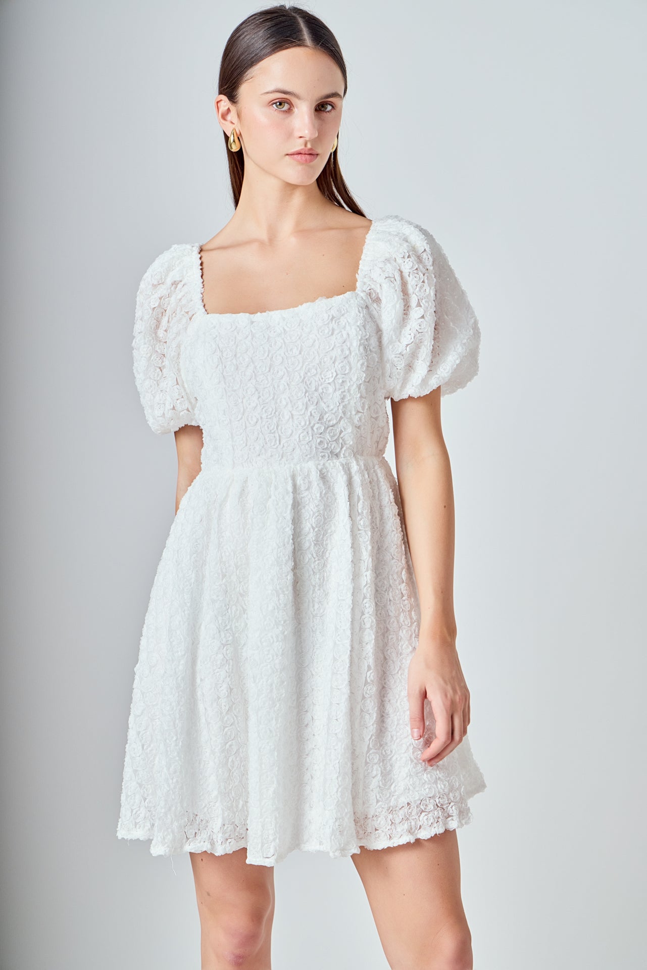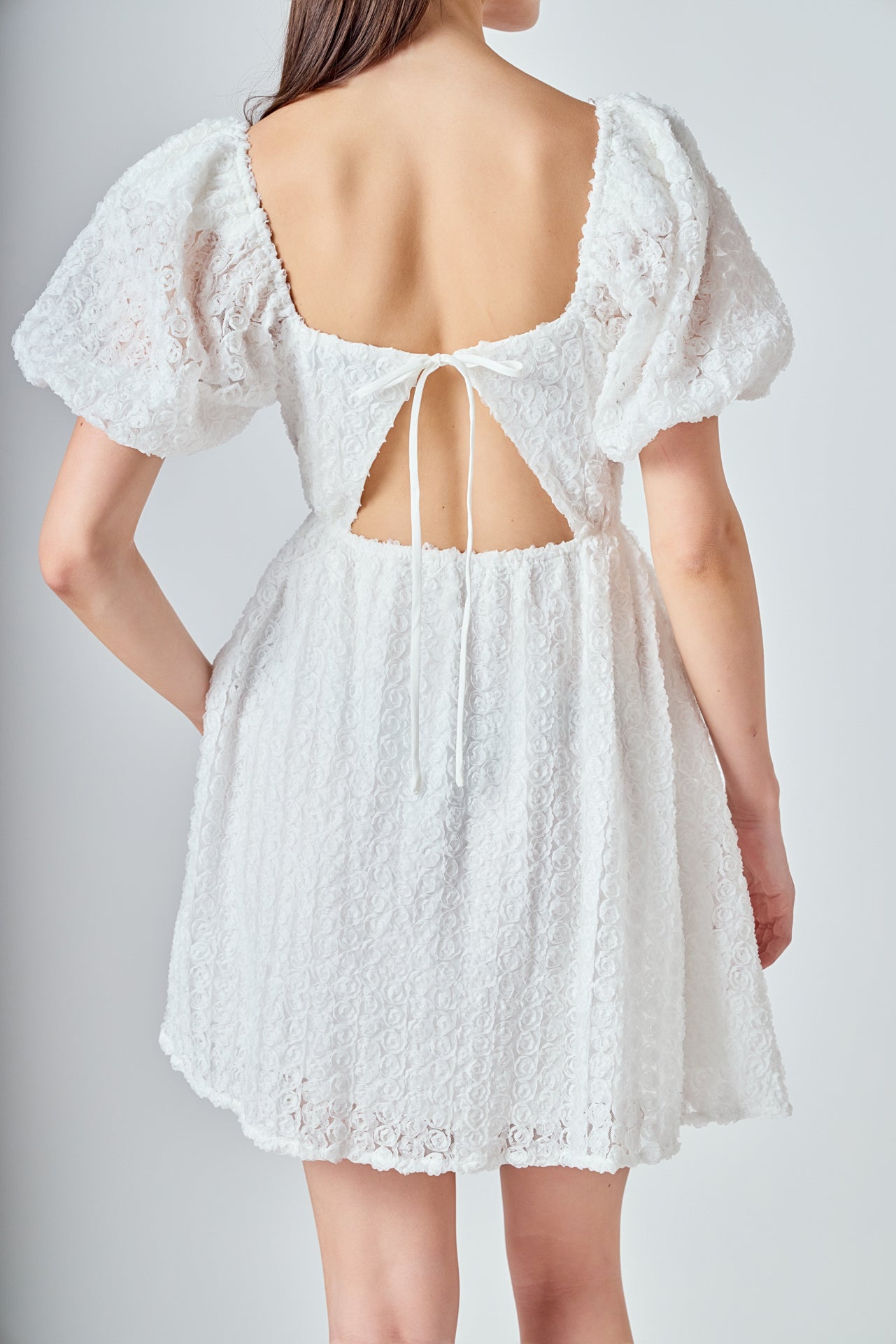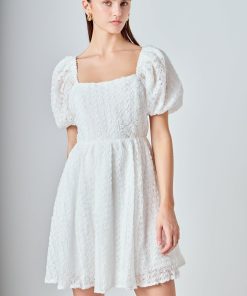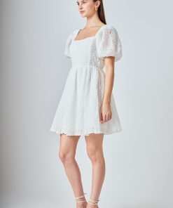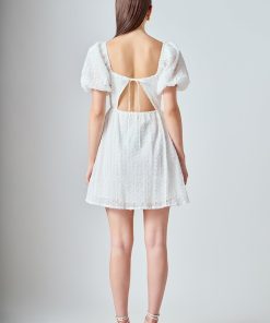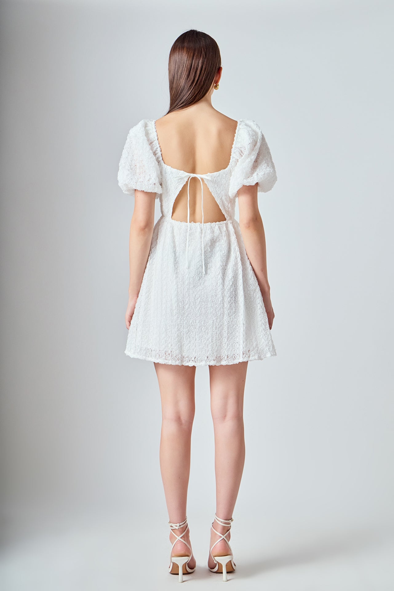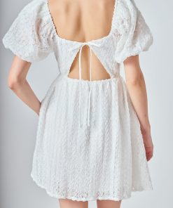 This dress is a true testament to the season. With its delicate floral texture and feminine puff sleeves, this mini dress is perfect for a special occasion or a day out with your besties. The back tie detail gives it an extra touch of elegance. Pair it with some sandals and a sunhat for an effortlessly chic look.