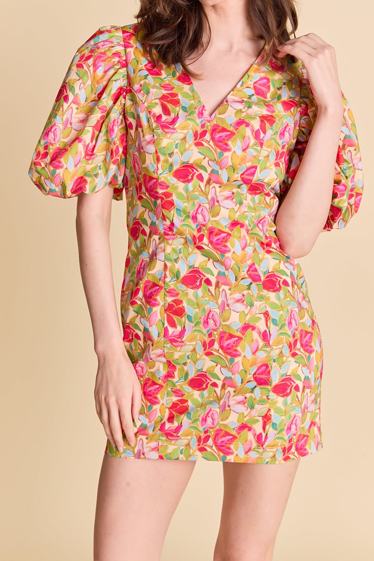Bring vibrant energy to your wardrobe with our Floral Print Mini Dress. The flattering V-neckline and voluminous puff sleeves create a playful silhouette, while the fitted waist and mini length highlight your natural curves with ease. Crafted in a bold floral pattern, this dress effortlessly adds feminine charm to your look. Ideal for everything from garden parties to city strolls, it’s a standout piece that brightens any occasion.