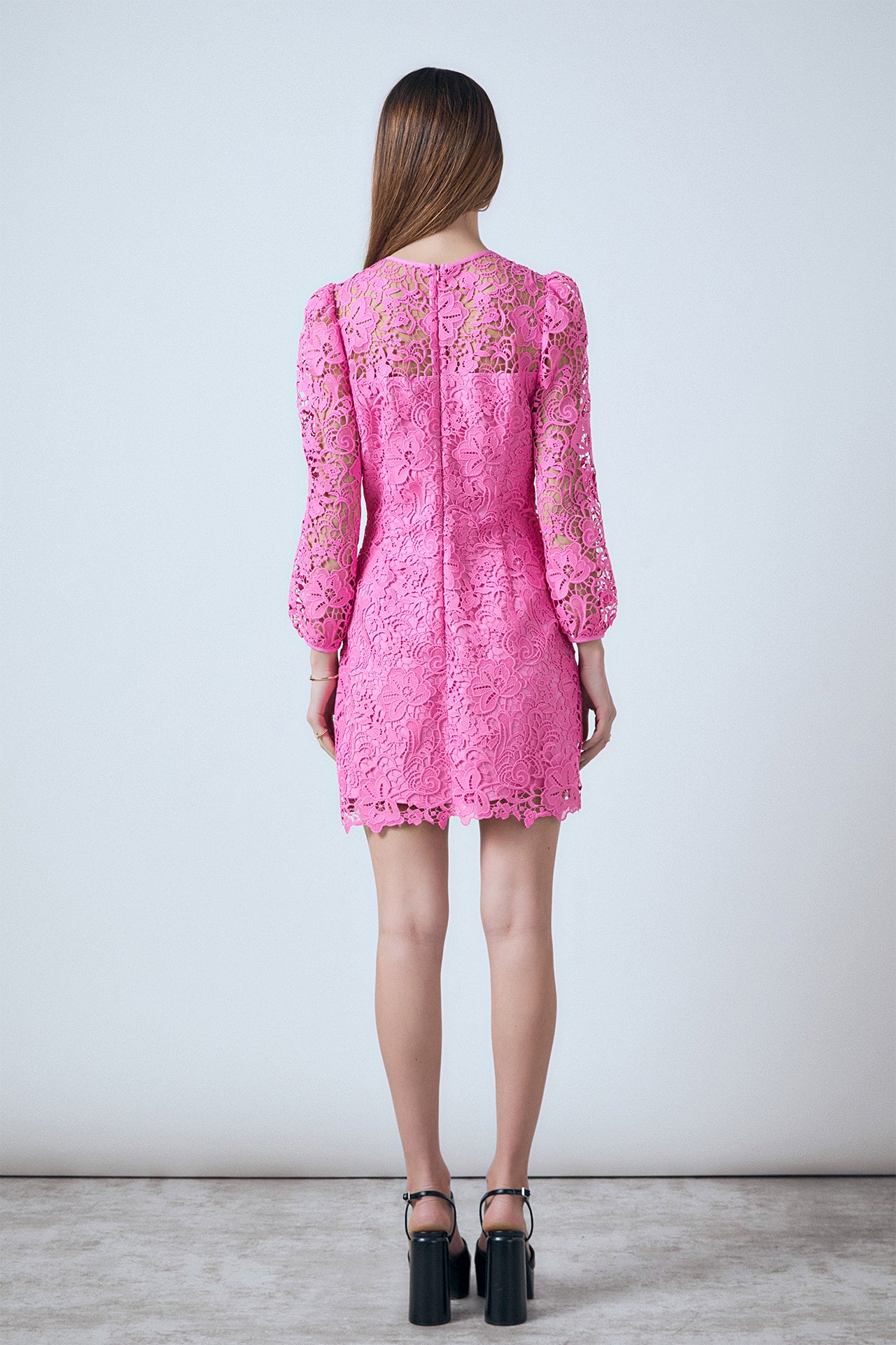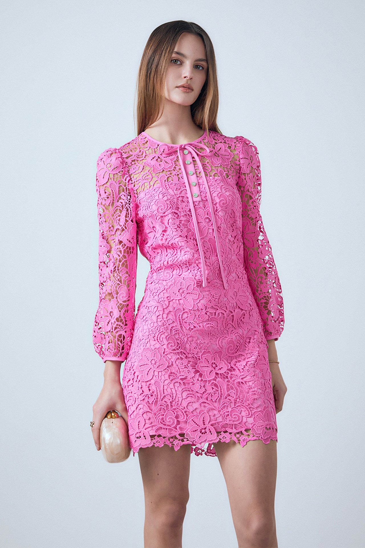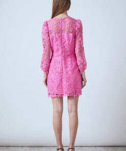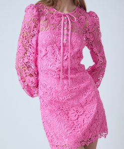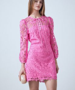 This Lace Mini Dress is a stunning dress that features a lace fabric that exudes grace, a round neckline that flatters, a front neck center ribbon to add a timeless look, and a front unfunctional placket with buttons. It is the ideal refined look for any occasion. This dress will make you look and feel beautiful while standing out. Get this gorgeous dress now as it will be the perfect addition to your wardrobe.