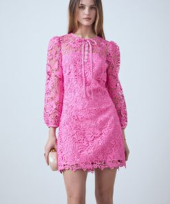 This Lace Mini Dress is a stunning dress that features a lace fabric that exudes grace, a round neckline that flatters, a front neck center ribbon to add a timeless look, and a front unfunctional placket with buttons. It is the ideal refined look for any occasion. This dress will make you look and feel beautiful while standing out. Get this gorgeous dress now as it will be the perfect addition to your wardrobe.