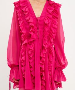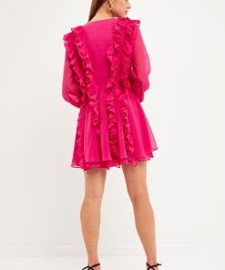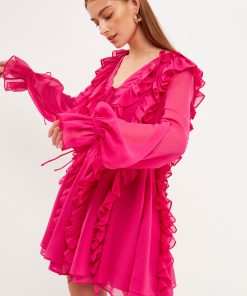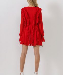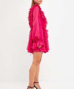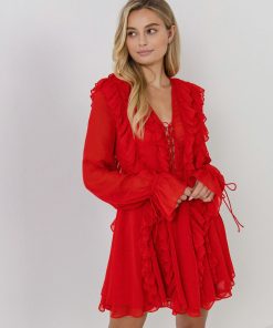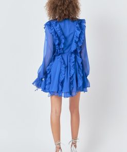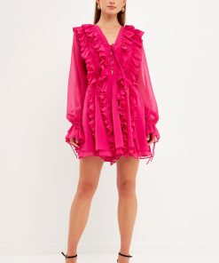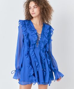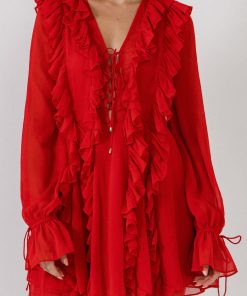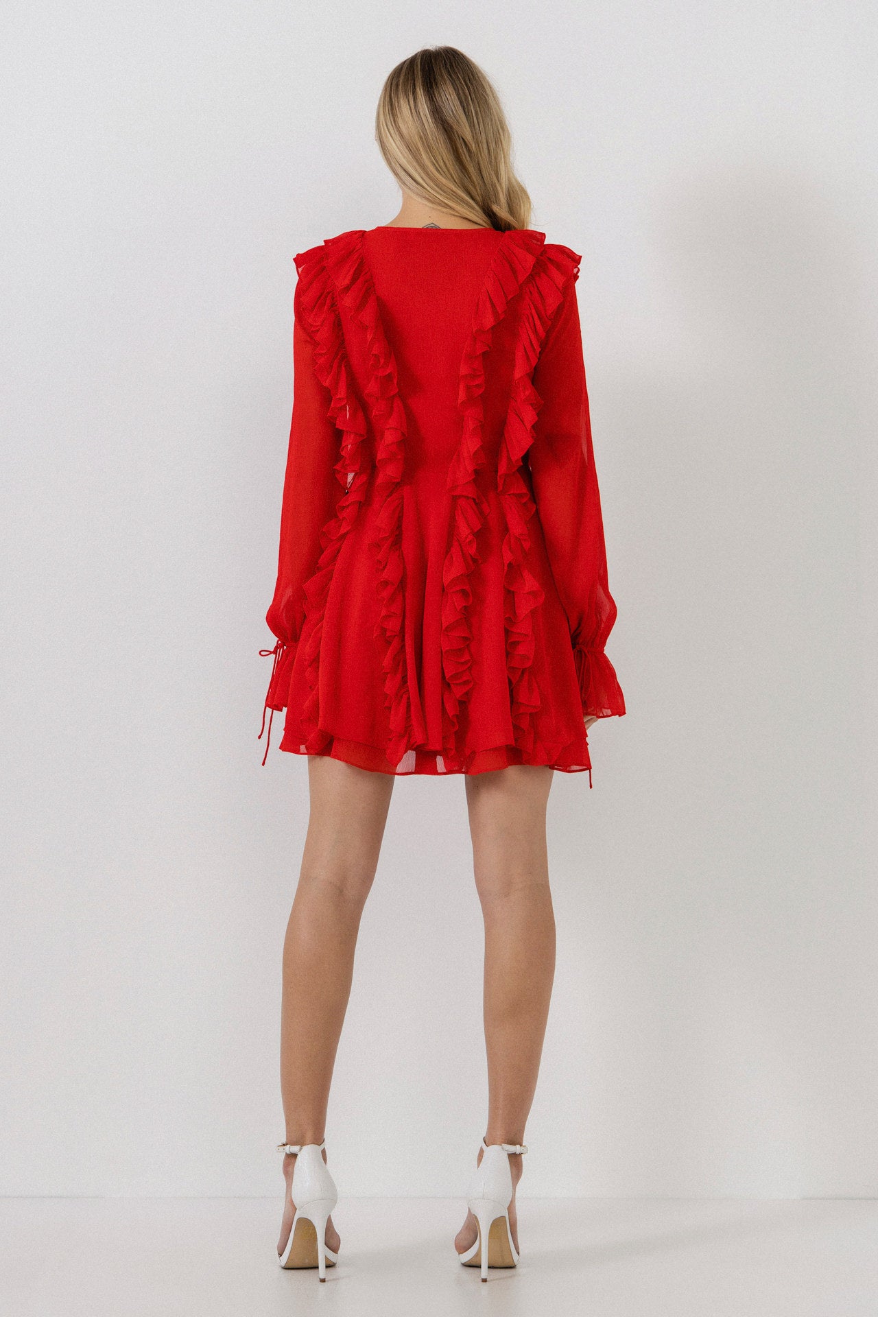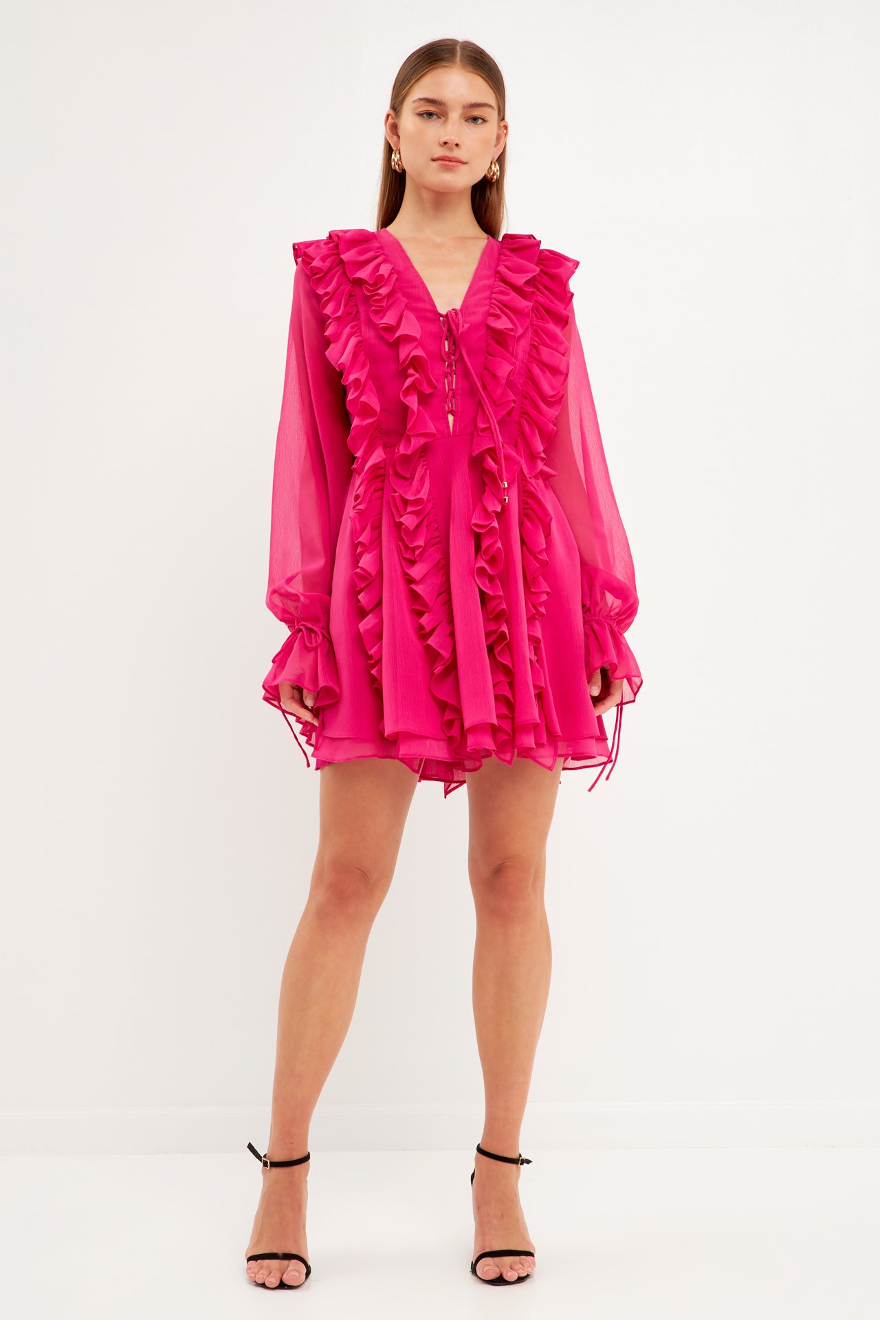 This leg-baring mini dress features cascading ruffles on the front and back that accentuate the flowy silhouette. The blouson sheer sleeves flow into wrist ties and a ruffle hem and the style is finished with a lace-up bust.