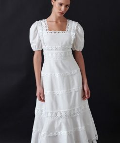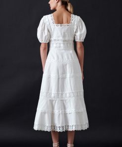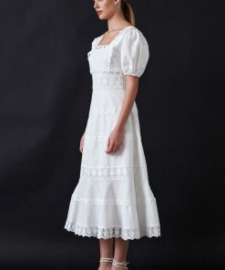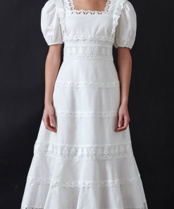 A dress for any occasion, this maxi dress features intricate lace trim and a flared tiered skirt for a touch of femininity. The short puff sleeves and side zipper make this dress easy to wear, while the lining ensures a comfortable fit. Whether you’re dressing up for a special occasion or looking for a casual dress to wear on a sunny day, this maxi dress is sure to become a staple in your wardrobe.