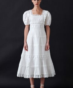 A dress for any occasion, this maxi dress features intricate lace trim and a flared tiered skirt for a touch of femininity. The short puff sleeves and side zipper make this dress easy to wear, while the lining ensures a comfortable fit. Whether you’re dressing up for a special occasion or looking for a casual dress to wear on a sunny day, this maxi dress is sure to become a staple in your wardrobe.