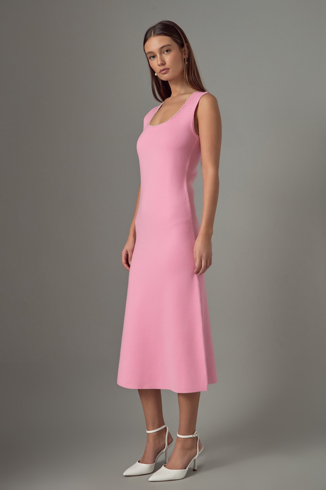 Elevate your wardrobe with our stunning Pearl Trim Knit Midi Dress. With a timeless midi length and flattering low neck drop, this dress is perfect for any occasion. The round neckline adds a touch of sophistication, while the delicate pearl trim adds a touch of elegance. Made from high-quality knit material, it offers a comfortable and stylish fit. Whether you’re heading to a formal event or a casual outing, this dress will surely turn heads. Don’t forget to accessorize with statement jewelry for a complete look. Shop now and add a touch of glam to your wardrobe.
