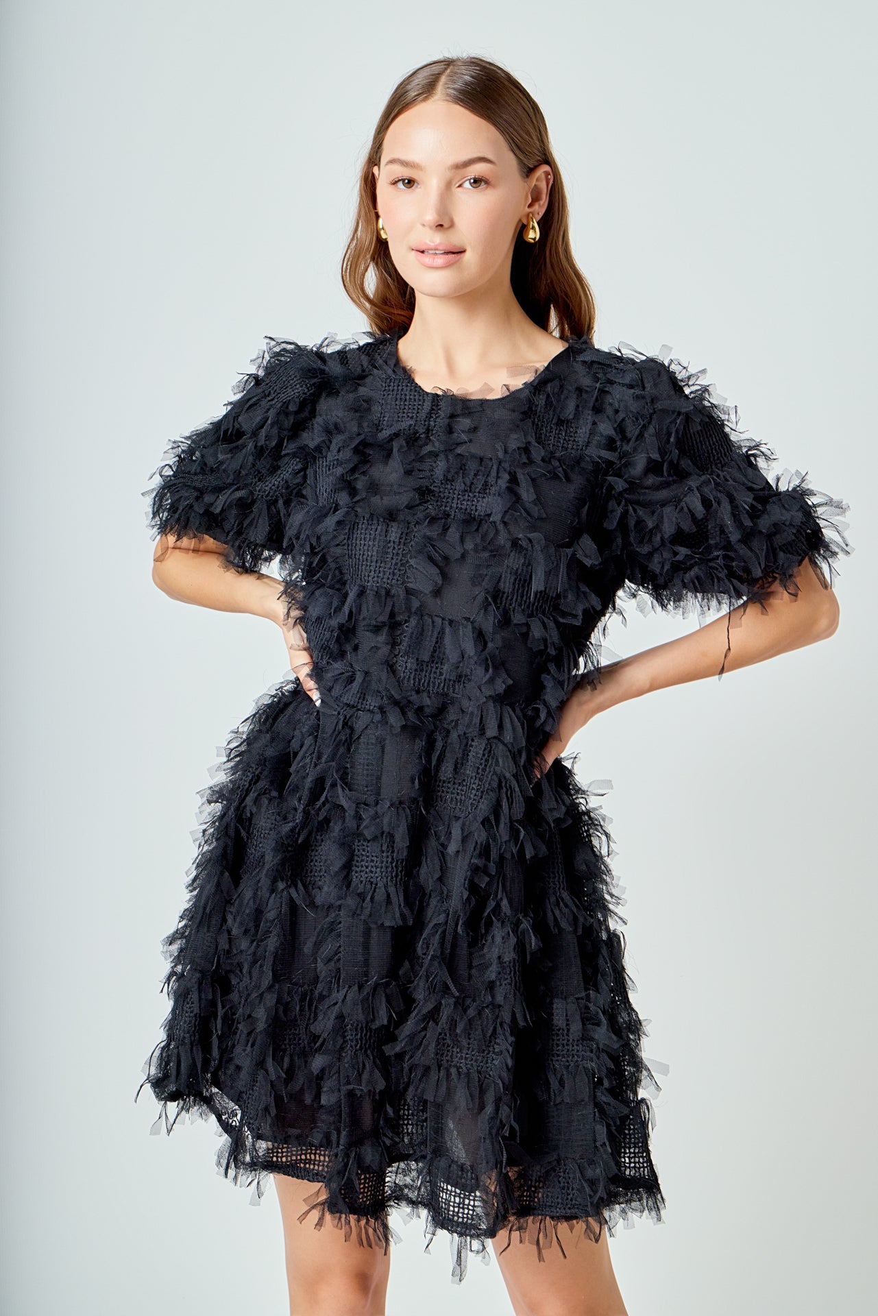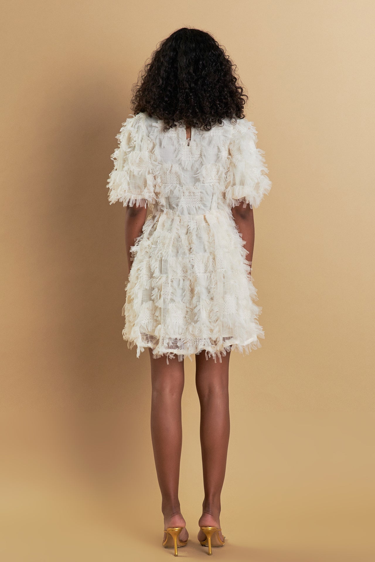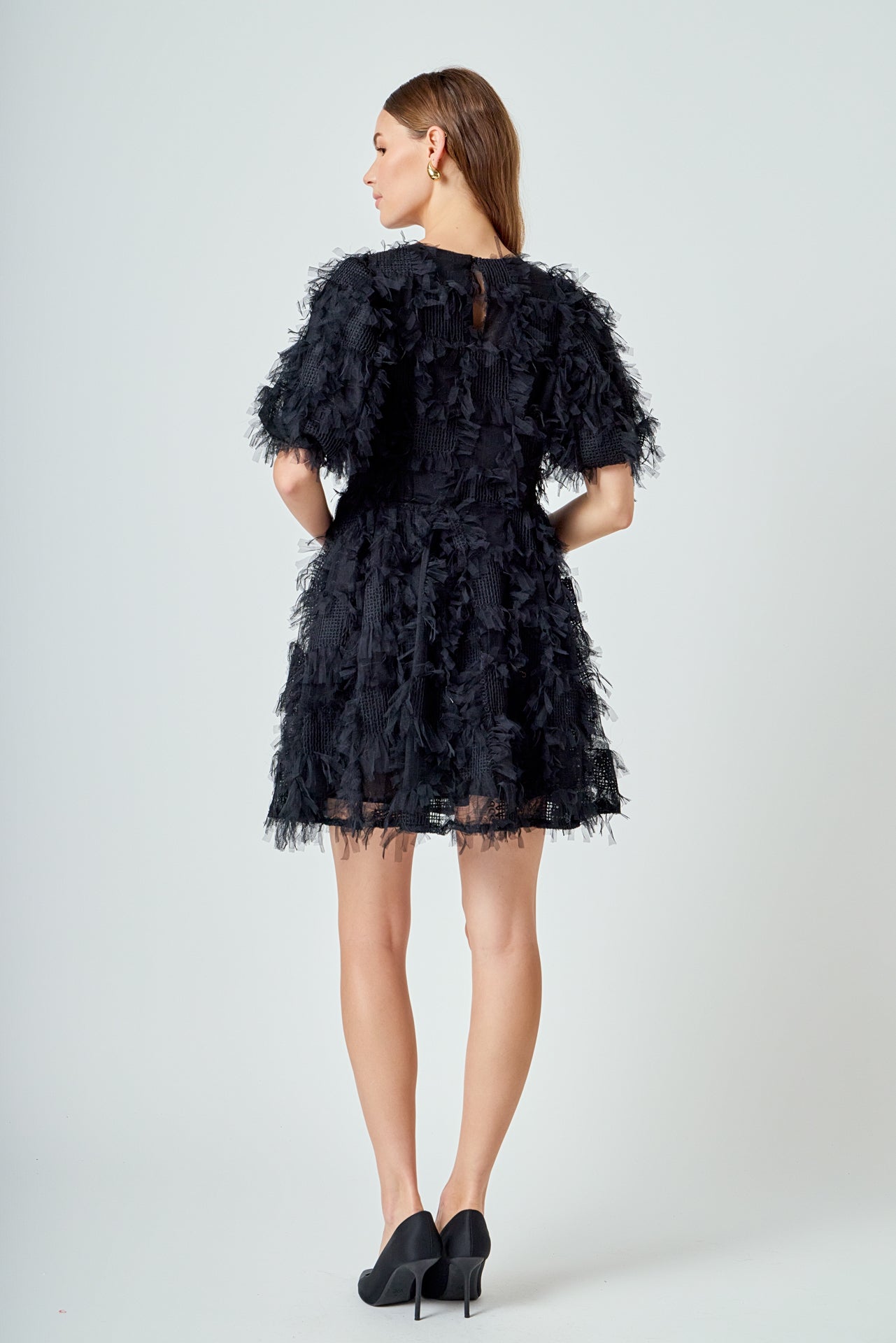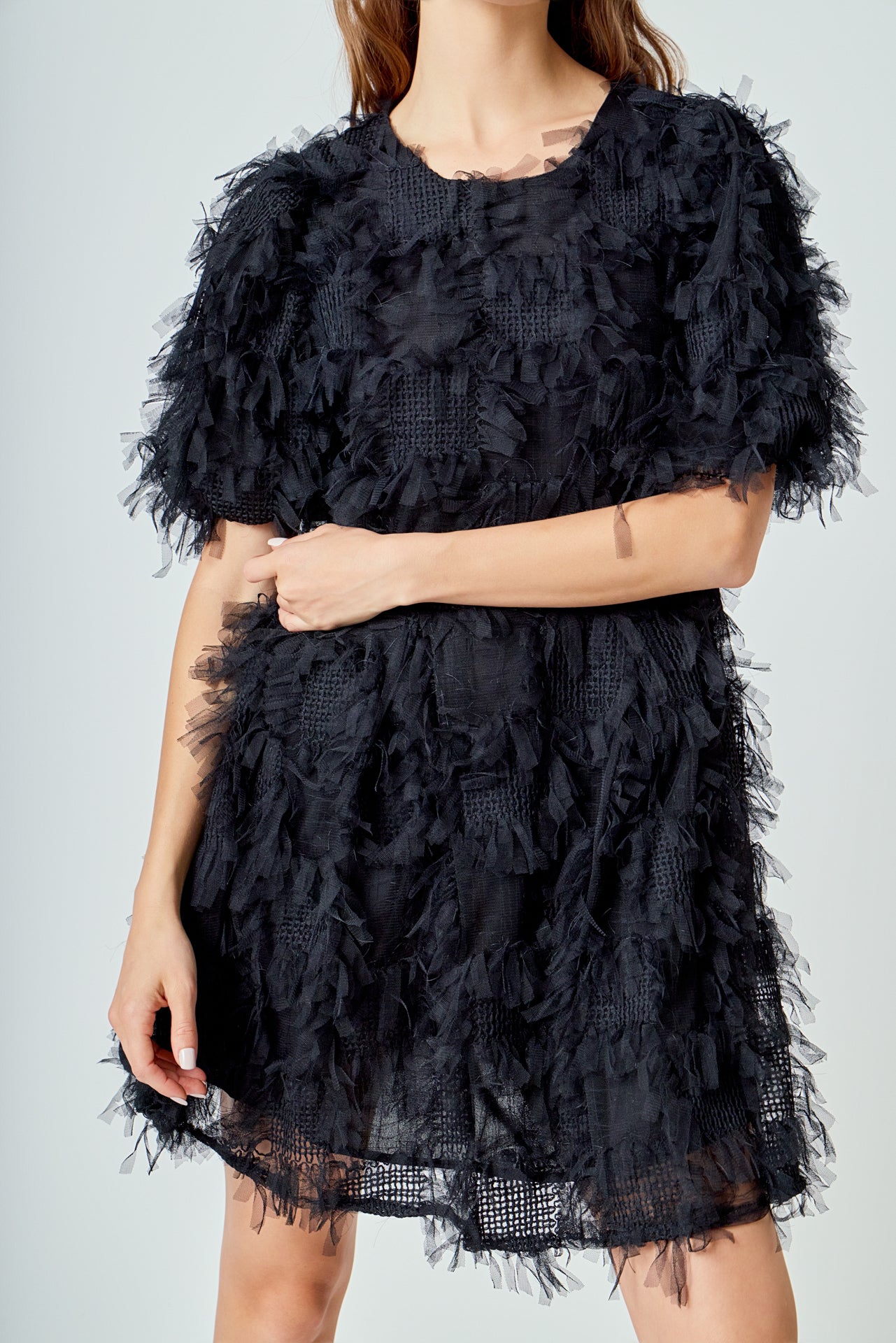 Add a touch of glamor to your everyday look with our Textured Mesh Mini Dress. The intricate mesh fabric and puffy sleeves create a whimsical look. This dress can easily be taken from day to night, and the relaxed fit means you’ll be comfortable all day long. Pair this dress with heels and a clutch for a look that will turn heads on your nights out, or style it with a denim jacket and sneakers for a cute and casual daytime outfit.