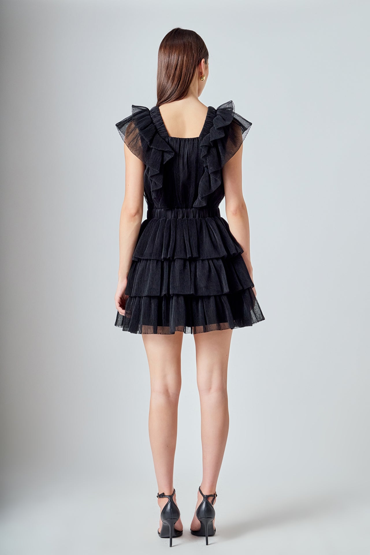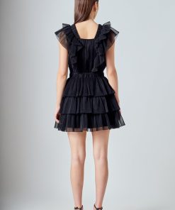 This elegant Tulle Ruffle Tiered Mini Dress is perfect for special occasions. It features a flattering front V neckline and a square neckline at the back complete with romantic ruffle detailing throughout. The tiered skirt adds a touch of feminine charm making this dress a must-have for your wardrobe. It’s a timeless piece that’s sure to turn heads at any event.