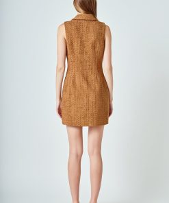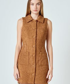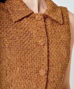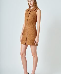 Introducing our stunning Tweed Collared Mini Dress, the perfect blend of sophistication and style. Made from high-quality tweed fabric, this dress boasts a luxurious texture and subtle checked pattern. The classic collar and front buttons add a touch of elegance, while the front pocket adds a functional detail. Perfect for any occasion, this dress is a versatile addition to any wardrobe. Upgrade your style game with our Tweed Collared Mini Dress, a must-have for fashion-forward women.