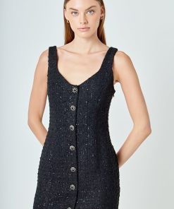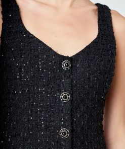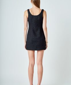 Introducing our stunning Tweed Mini Dress, a must-have addition to your dresses collection. This dress features a flattering sweetheart neckline and chic sleeveless design, perfectly complementing the mini length for a trendy and stylish look. The non-functional buttons at the center add a touch of elegance to this dress. Ideal for any occasion, this Tweed Mini Dress will turn heads and make you stand out from the crowd. Don’t miss out on this unique piece. Shop now and enjoy effortless style with our Tweed Mini Dress.