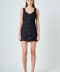 Introducing our stunning Tweed Mini Dress, a must-have addition to your dresses collection. This dress features a flattering sweetheart neckline and chic sleeveless design, perfectly complementing the mini length for a trendy and stylish look. The non-functional buttons at the center add a touch of elegance to this dress. Ideal for any occasion, this Tweed Mini Dress will turn heads and make you stand out from the crowd. Don’t miss out on this unique piece. Shop now and enjoy effortless style with our Tweed Mini Dress.