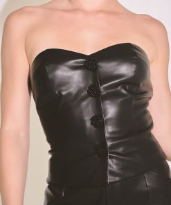 Experience the stylish sophistication of our Faux Leather Strapless Top. This top features a striking leather design and a fitted silhouette for a modern sophisticated look. With a strapless cut it’s the perfect choice for an updated look. Finished with a front button closure it adds an element of sophistication and class to any ensemble. Whether you’re attending a formal event or looking to dress up an everyday outfit this top is sure to make the perfect addition to your wardrobe.