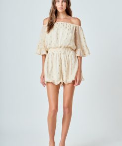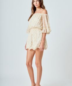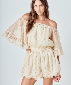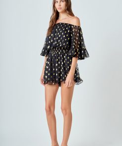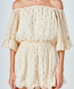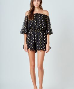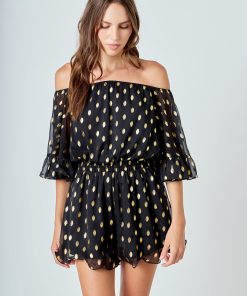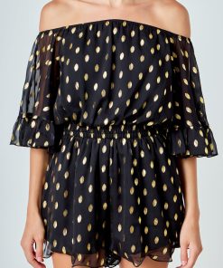 This romper is an effortlessly chic choice for any warm-weather occasion. The allover foil dot print lends a touch of whimsy, while the cinched waist and flounce hem shorts create a flattering silhouette. Dress it up with strappy heels and statement earrings or keep it casual with flat sandals and a jean jacket.