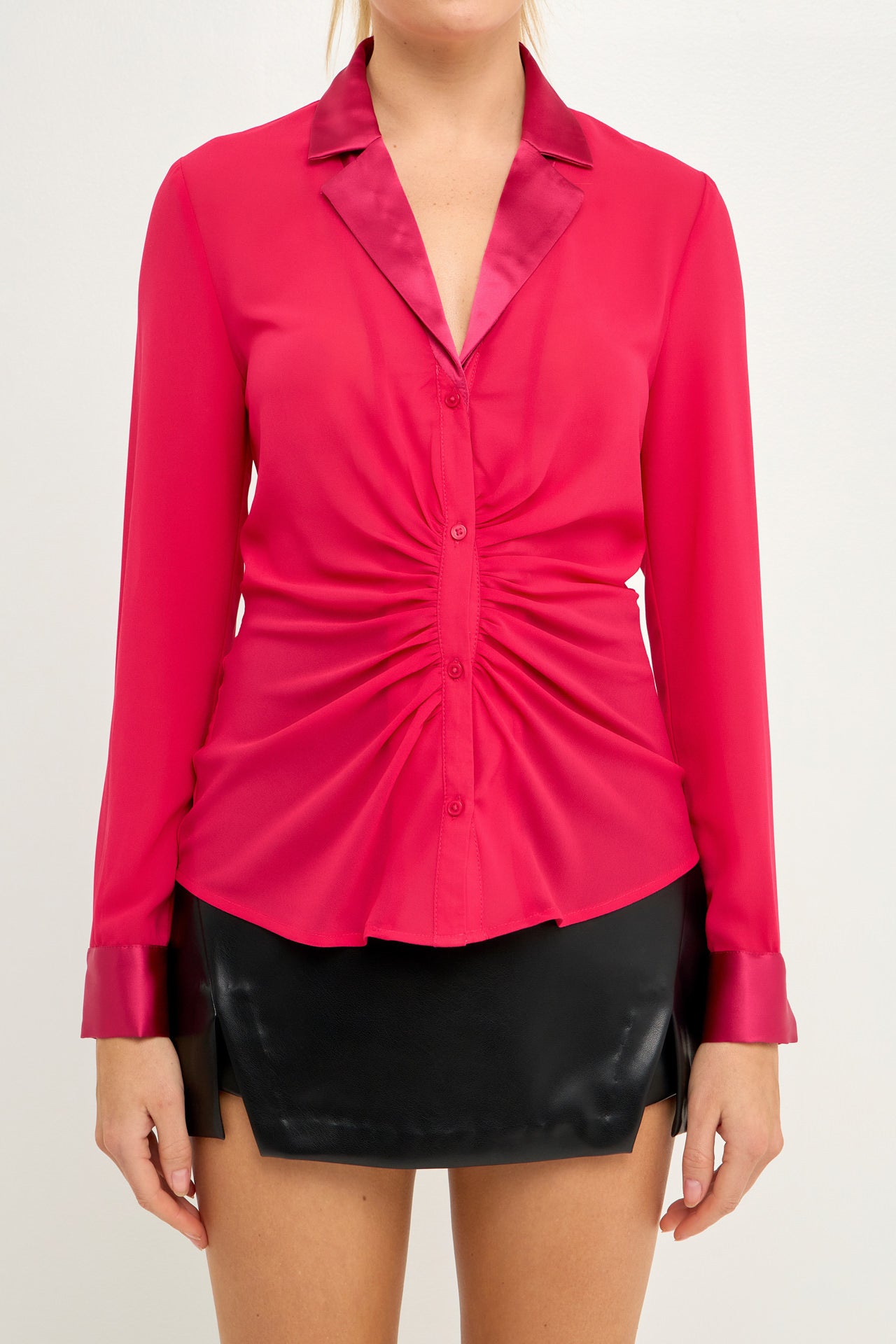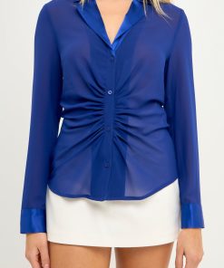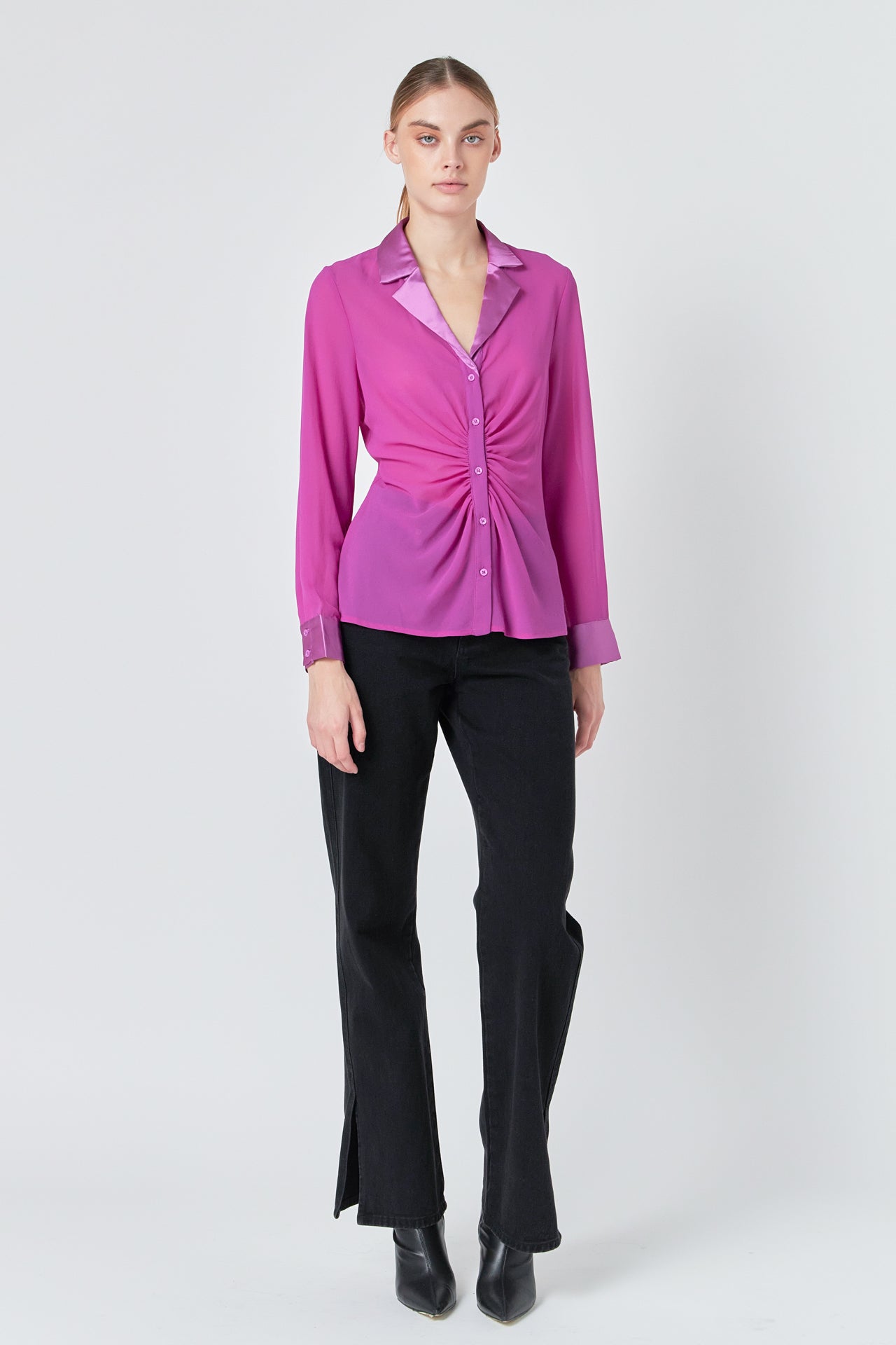 The mixed media chiffon blouse is a must have in every fashionista’s wardrobe. This blouse is perfect for dressing up or dressing down. With a cinched waist detail, collar and lapel, and front buttons, this top can go from day to night in an instant. Pair it with your favorite jeans or trousers for a timeless look.