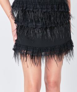 This stunning Lace & Feather Trim Mini Skirt is the perfect wardrobe addition for any occasion. Its mini length tier of lace and delicate feathers and its fully lined design make it a truly must-have item. The ideal piece to dress up or down this mini skirt is a great way to add a unique and stylish touch to your look. Look fabulous in this must-have piece!