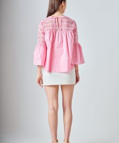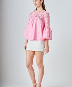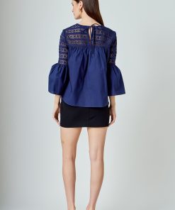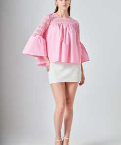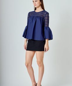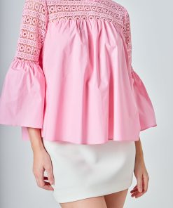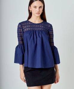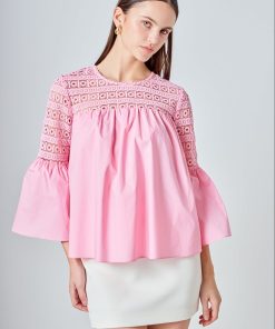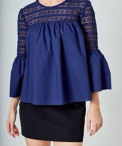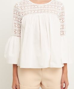 Look stylish yet feminine in this Lace with Poplin Bell Sleeve Blouse! This sophisticated and fashionable blouse is made up of delicate lace and features a trendy bell sleeve design for a stunning look. Its lightweight fabric construction allows for comfortable wearing and proper air circulation. Versatile and feminine, this blouse is perfect for both day and night. Get ready to show off your best side with this must-have blouse!