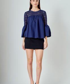 Look stylish yet feminine in this Lace with Poplin Bell Sleeve Blouse! This sophisticated and fashionable blouse is made up of delicate lace and features a trendy bell sleeve design for a stunning look. Its lightweight fabric construction allows for comfortable wearing and proper air circulation. Versatile and feminine, this blouse is perfect for both day and night. Get ready to show off your best side with this must-have blouse!