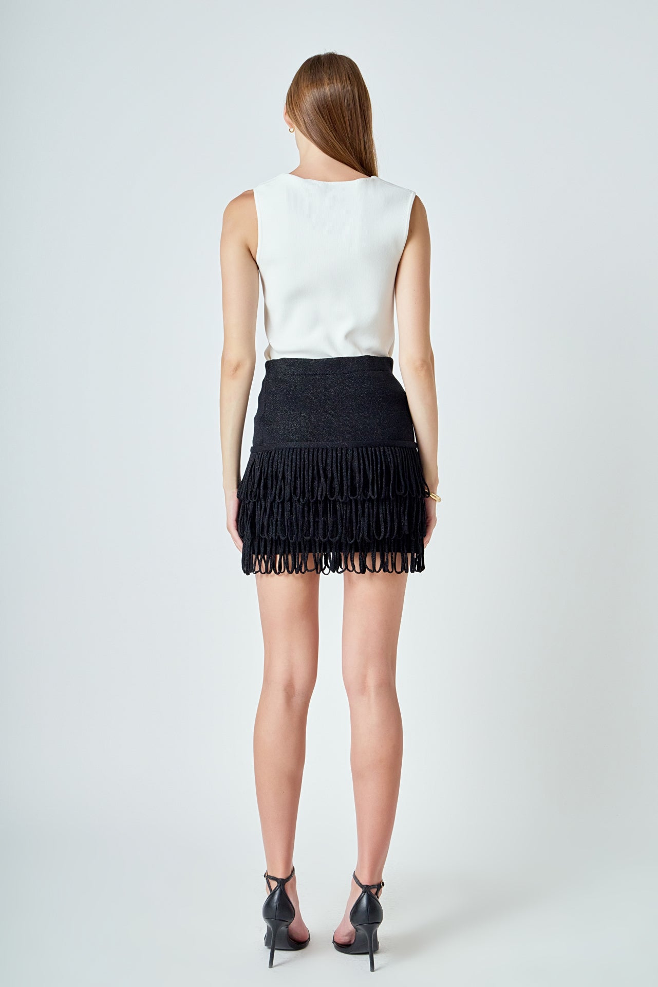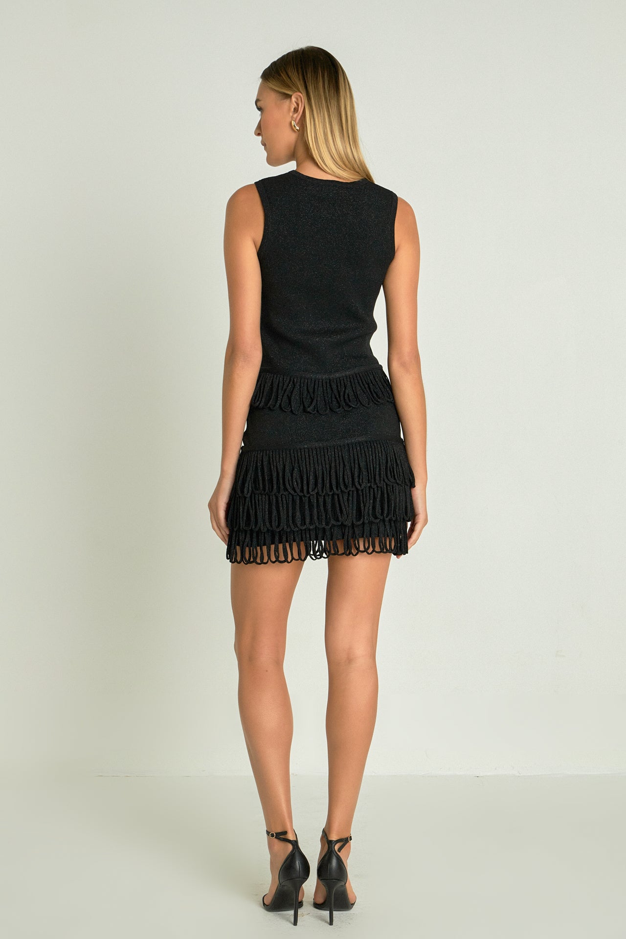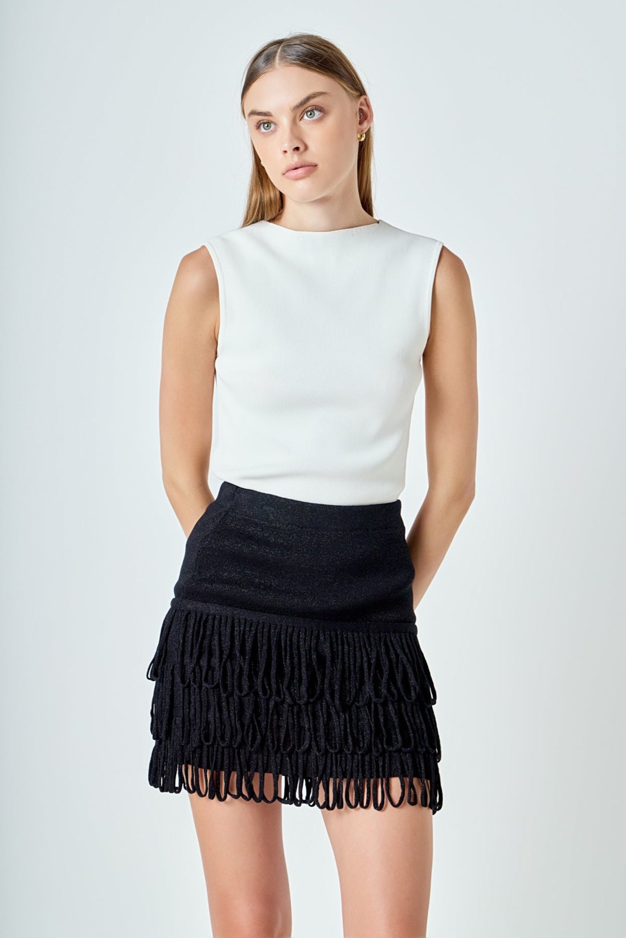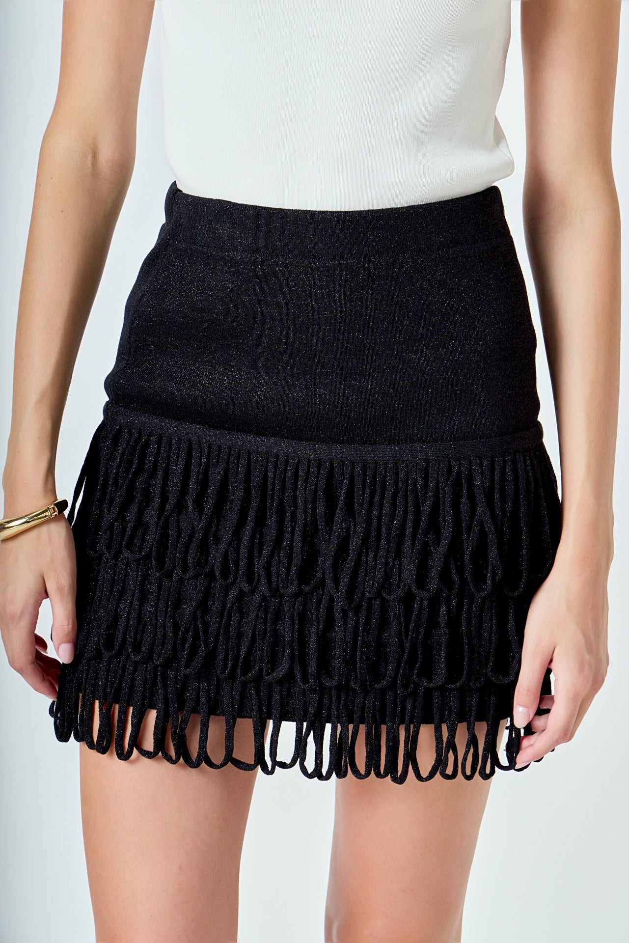 Introducing our Lurex Knit Loop Mini Skirt, a must-have addition to your skirt collection. Made from high-quality knit material, it promises to keep you comfortable and stylish all day long. The waistband ensures a perfect fit while the lurex detailing adds a touch of shimmer to your outfit. But what sets this skirt apart are the fringed loops, adding a unique and playful element to your look. Perfect for any occasion, wear it with a cute top and heels for a chic look. Buy now and add some sparkle to your wardrobe!