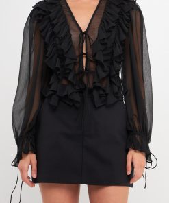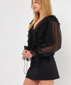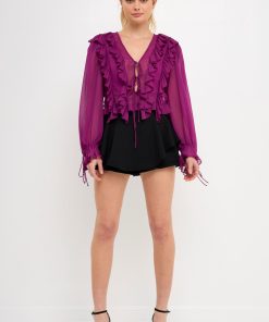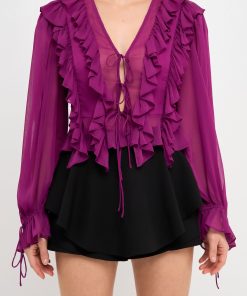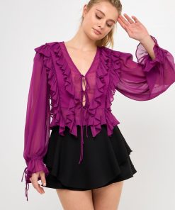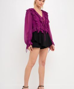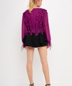 Spice up your wardrobe with this Multi Ruffled Long Sleeve Blouse from Endless Rose. This cropped blouse features a front spaghetti tie closure, ruffled bodice, long bishop sleeves, and V-neckline. With its many fun and flirty details, this blouse is perfect for a night out on the town or a day at the office.