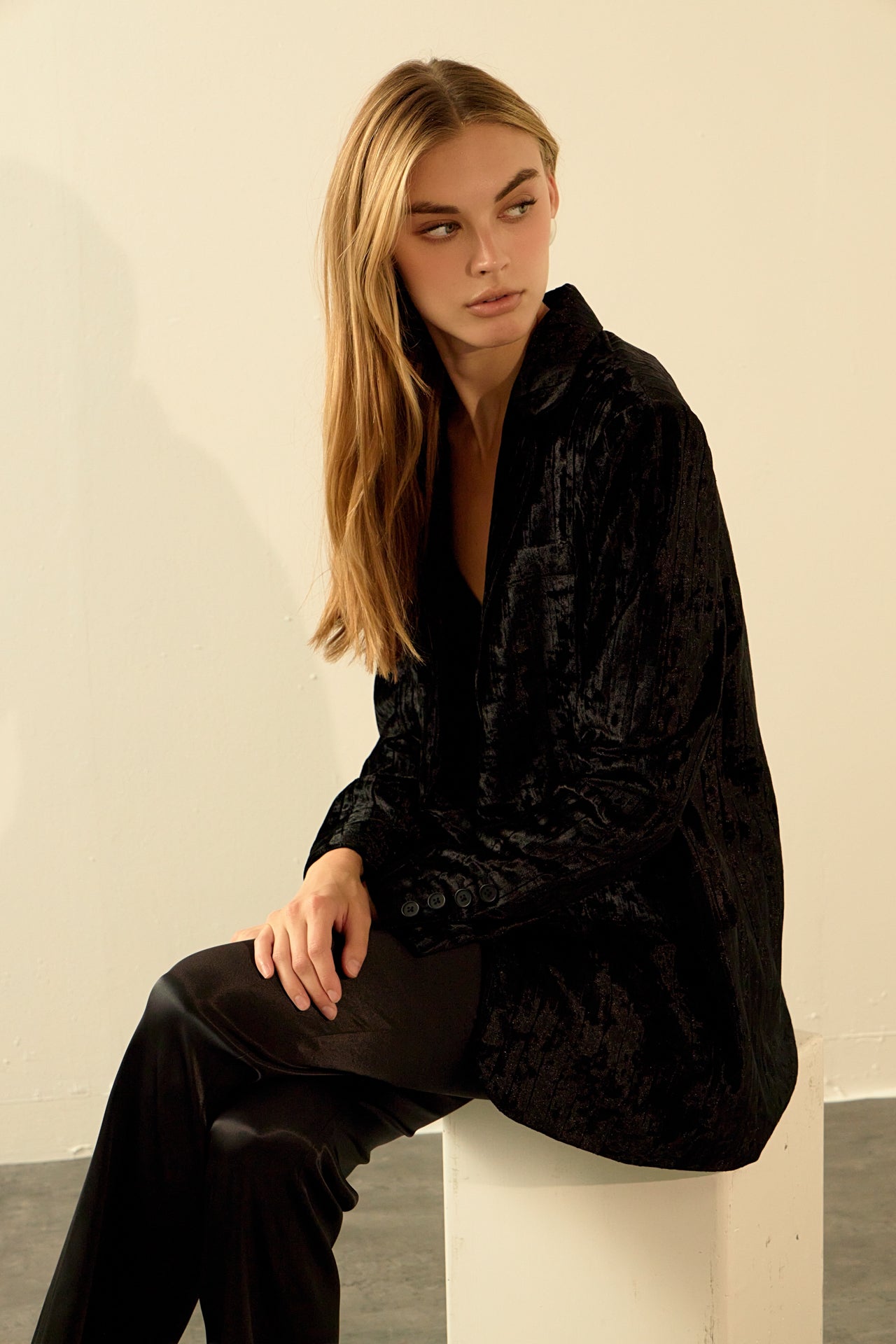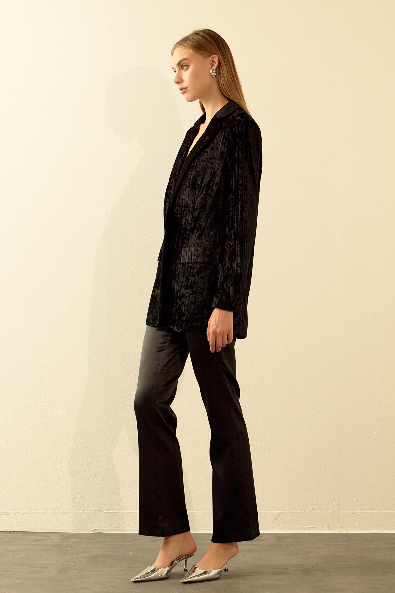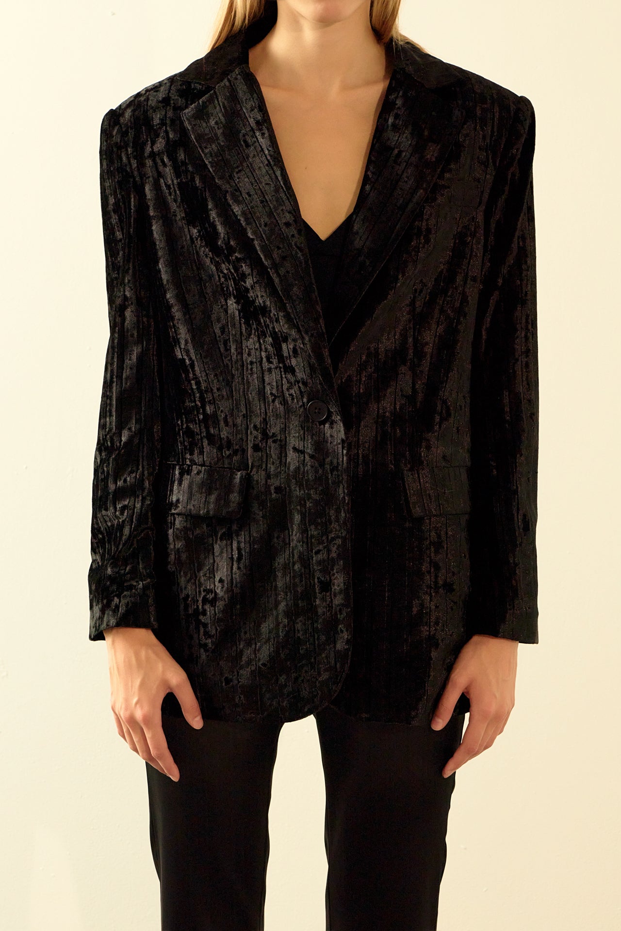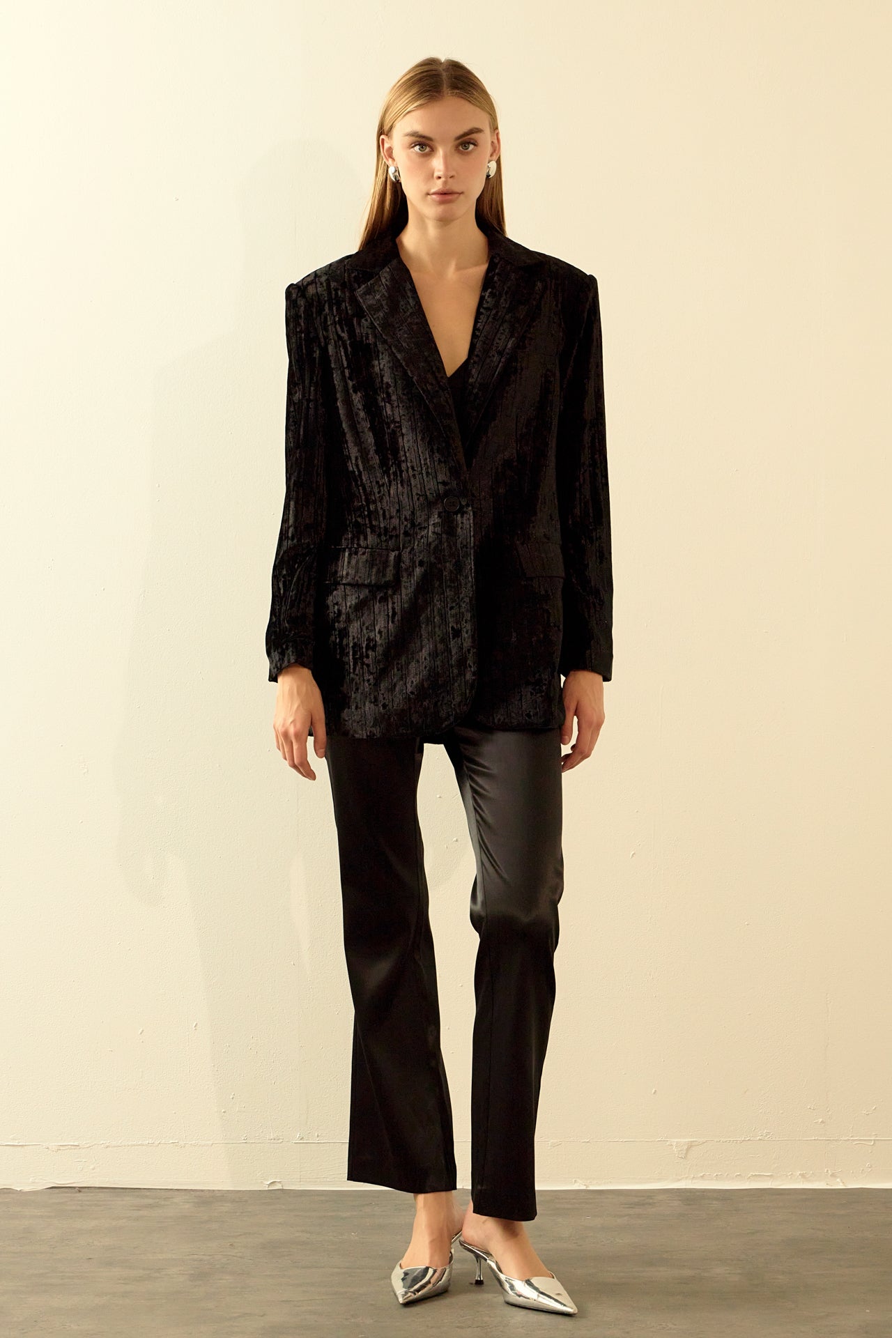 Take your blazer game to the next level with our luxurious Oversized Velvet Blazer from endless rose. With classic details like shoulder pads, jetted pockets with flaps, and a notch lapel, this blazer is perfect for your next big meeting or a hot date.