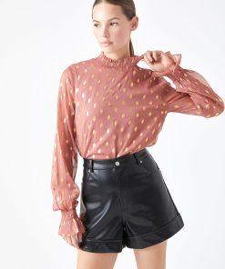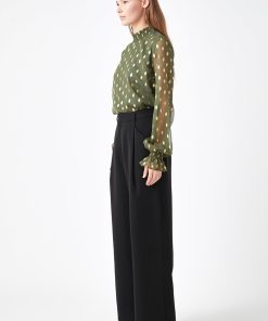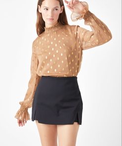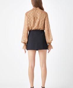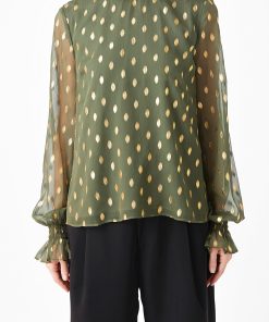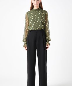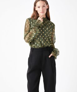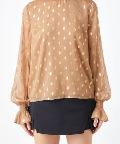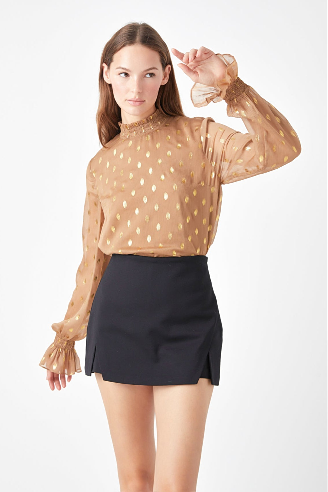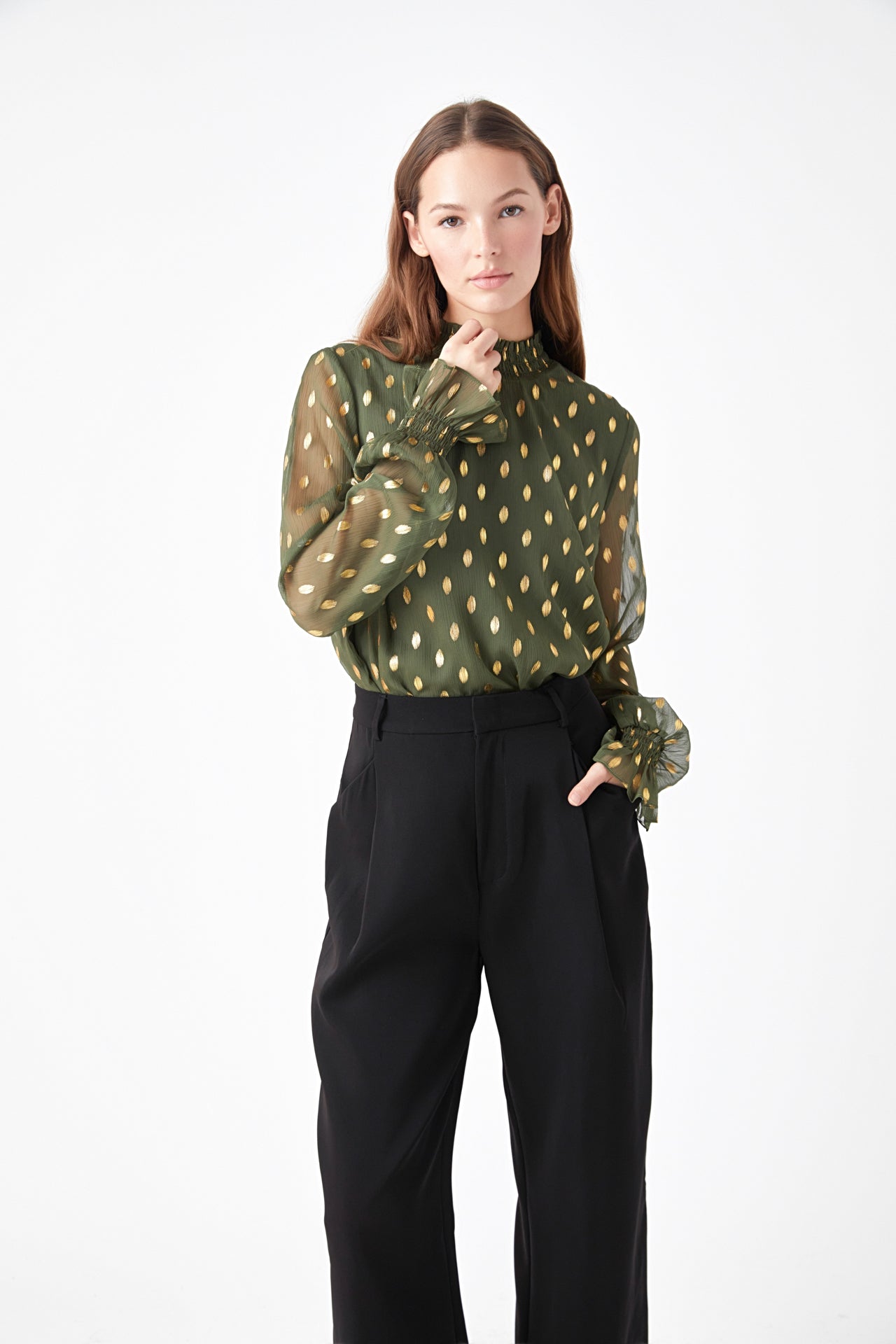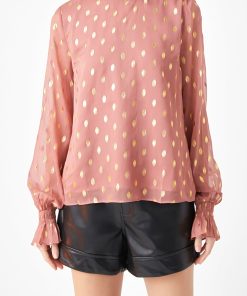 This elegant chiffon blouse features a metallic polka dot print. With feminine touches like ruffled sleeve hems and a back keyhole detail, it’s the perfect blouse to dress up any look with ease. Tuck this blouse into your favorite jeans, high-waisted pants, or skirt, and you’ll instantly create a chic, sophisticated look.