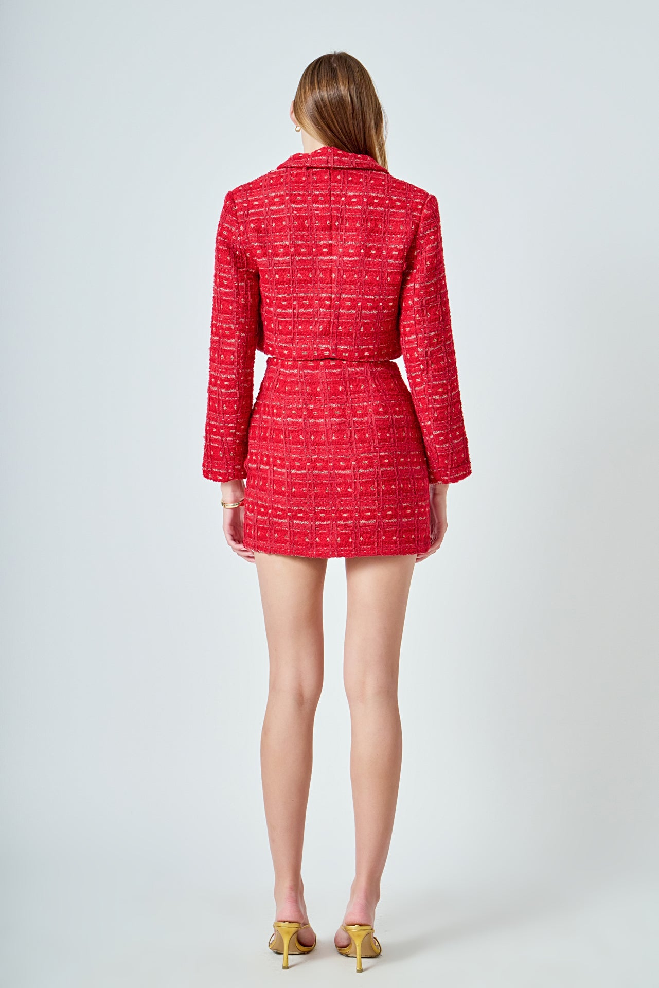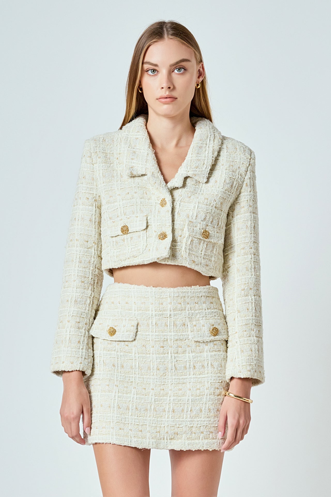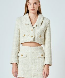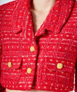 This cropped jacket is constructed with high-quality tweed and detailed gold buttons. Also, the shoulder pads add a structured element to the piece, so it lays on you beautifully.