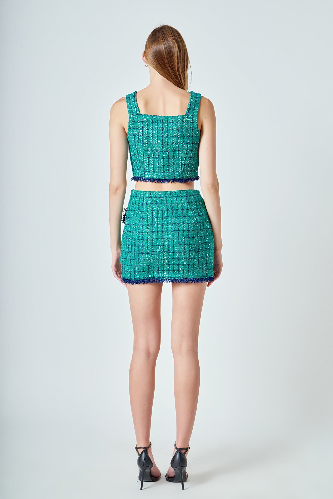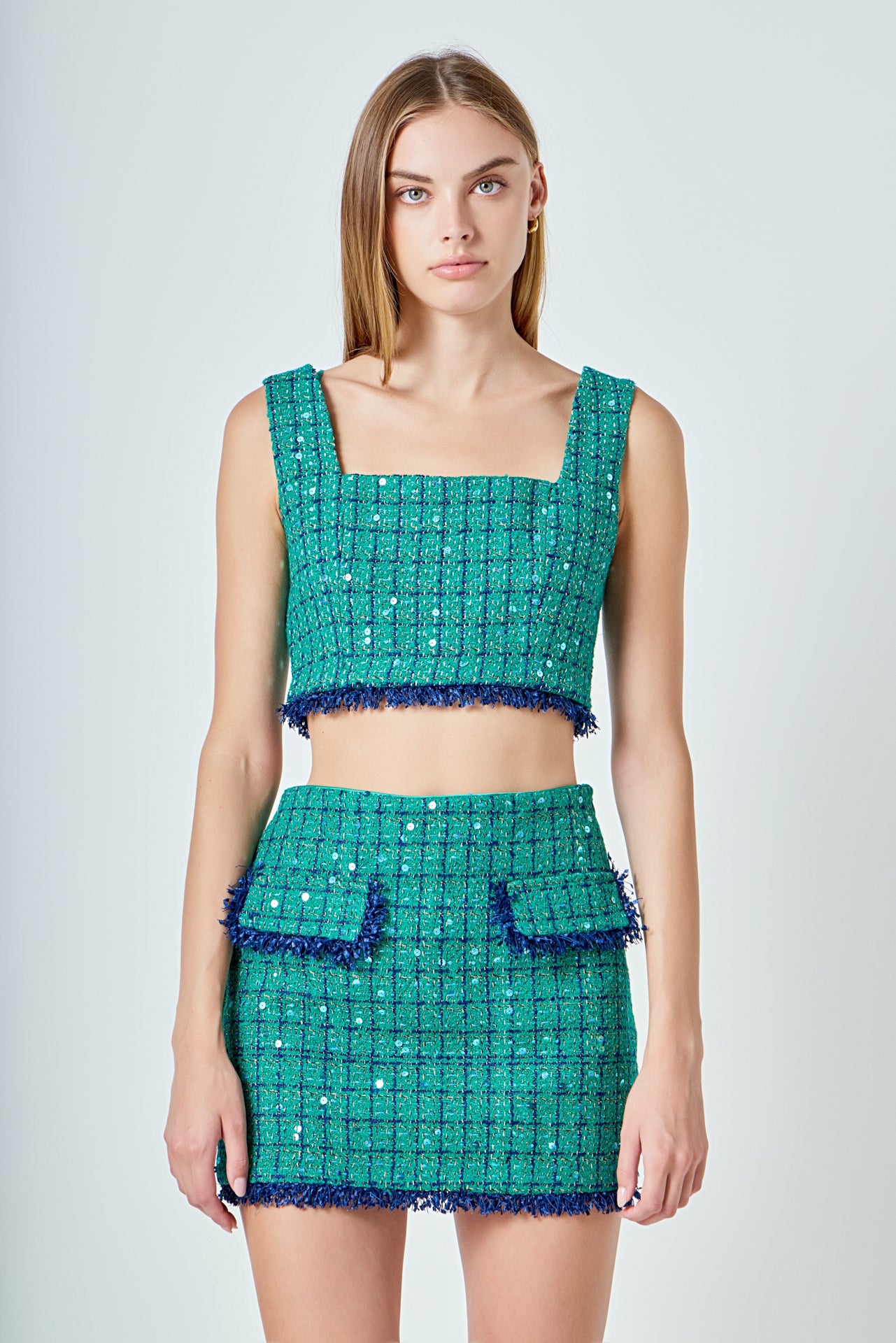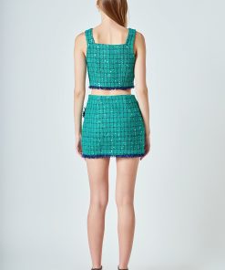 Crafted from luxurious sequin tweed and finished with delicate fringe trim, this cropped top is a standout piece that blends sophistication with a touch of sparkle. The structured square neckline adds a flattering, modern edge, while the fully lined interior ensures a smooth and comfortable fit. Perfect for pairing with the matching high-waisted skirt or tailored trousers, this versatile piece transitions seamlessly from day to night, making it a chic addition to any wardrobe.