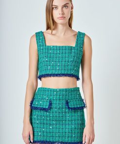 Crafted from luxurious sequin tweed and finished with delicate fringe trim, this cropped top is a standout piece that blends sophistication with a touch of sparkle. The structured square neckline adds a flattering, modern edge, while the fully lined interior ensures a smooth and comfortable fit. Perfect for pairing with the matching high-waisted skirt or tailored trousers, this versatile piece transitions seamlessly from day to night, making it a chic addition to any wardrobe.