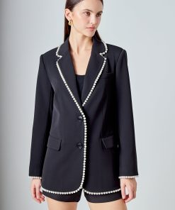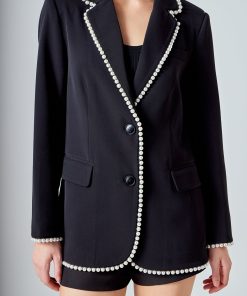 Step up your style game with this elegant Premium Pearl-Trimmed Blazer. Crafted with a classic oversized look and two button closure this chic blazer features long sleeves with pearl trim edges shoulder pads and a notched collar for an eye-catching look. It is fully lined to provide you a comfortable feel.