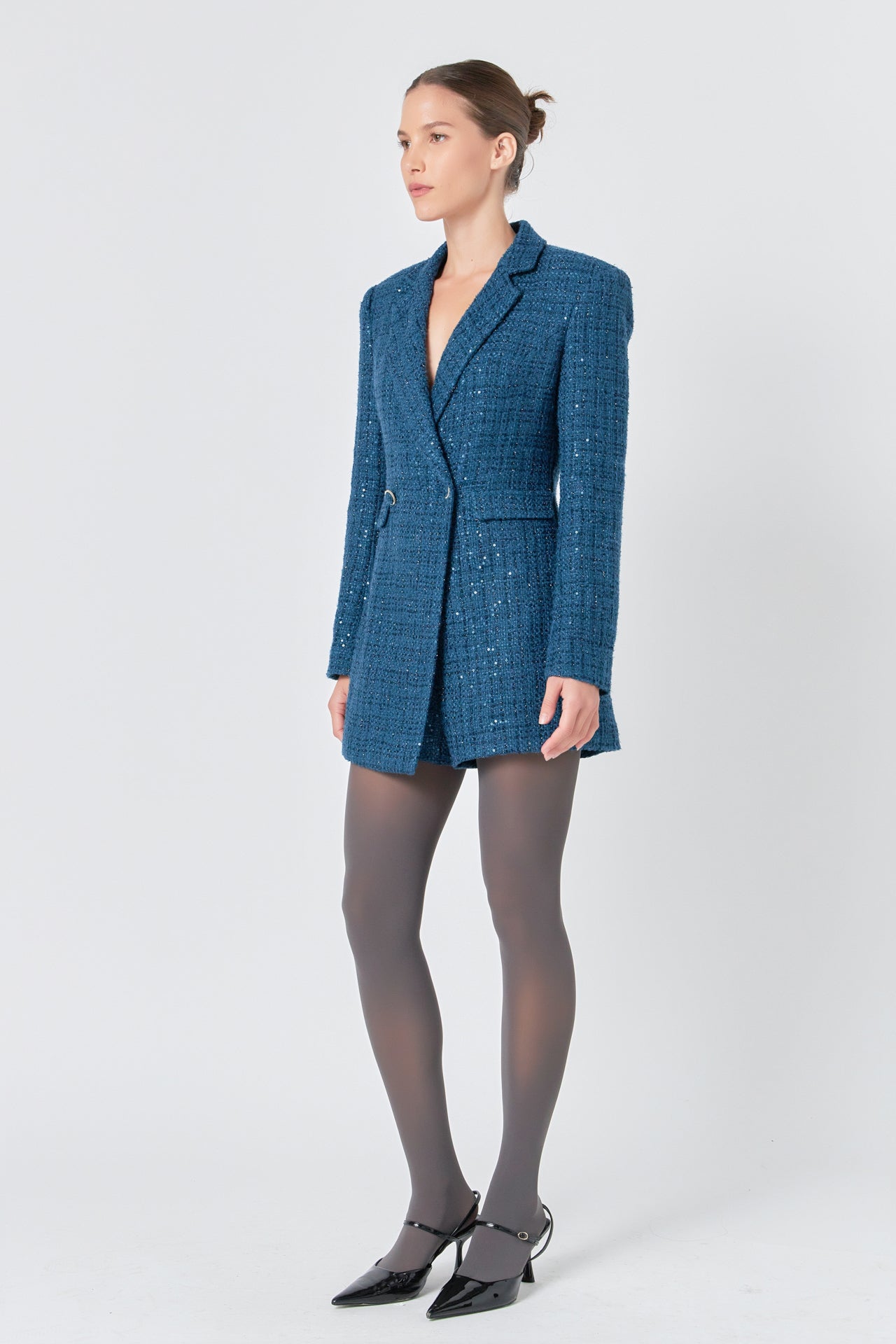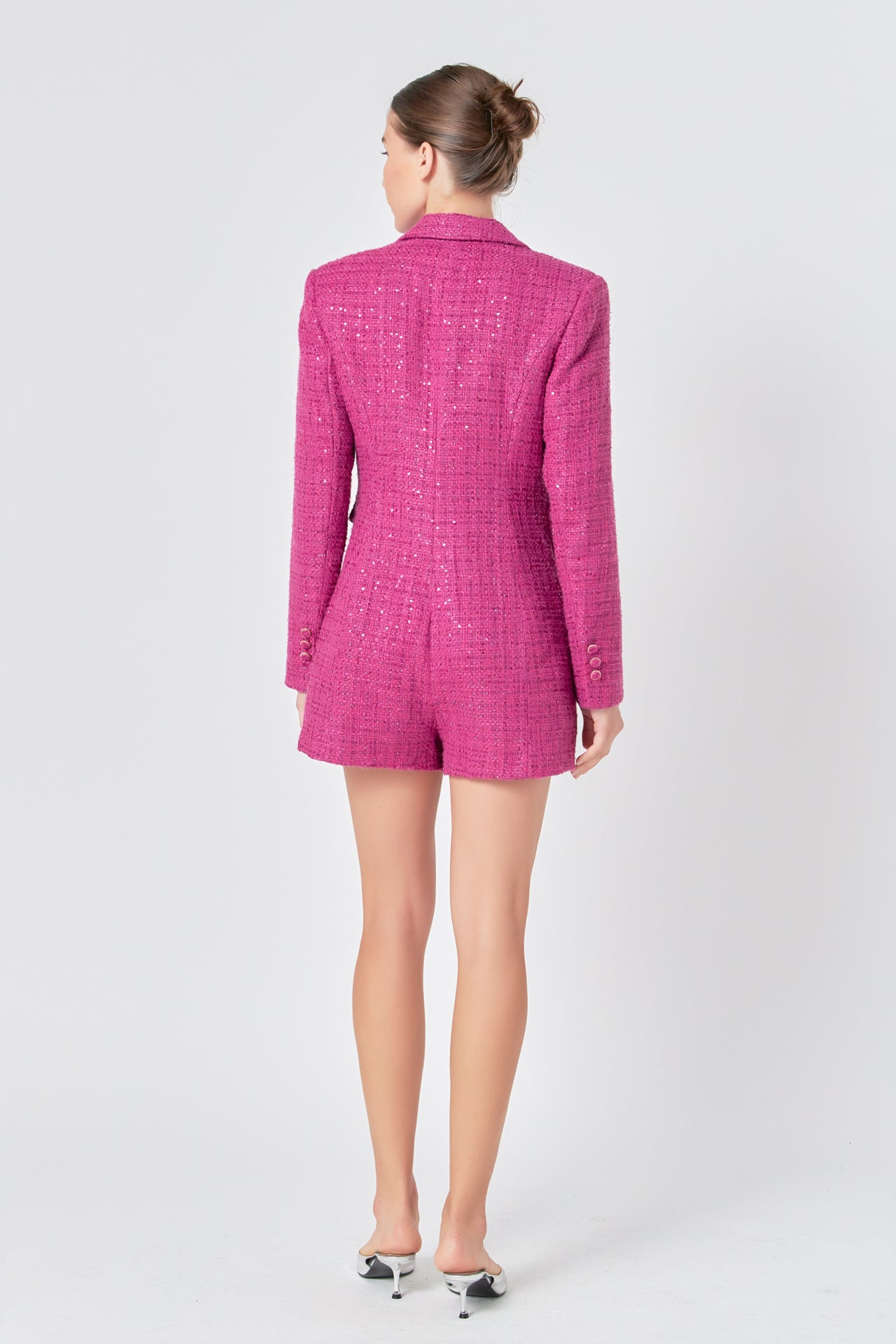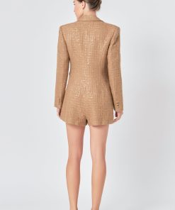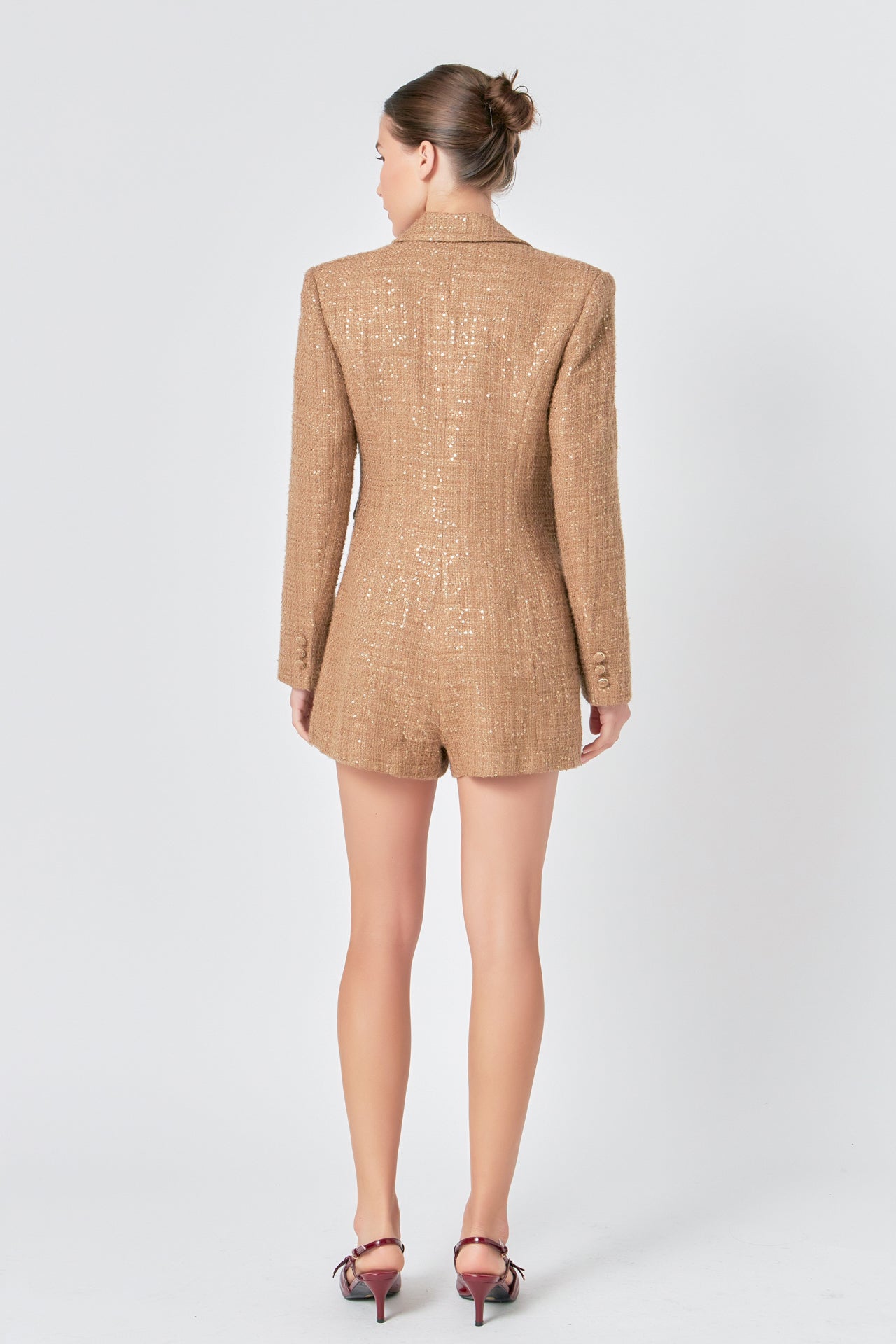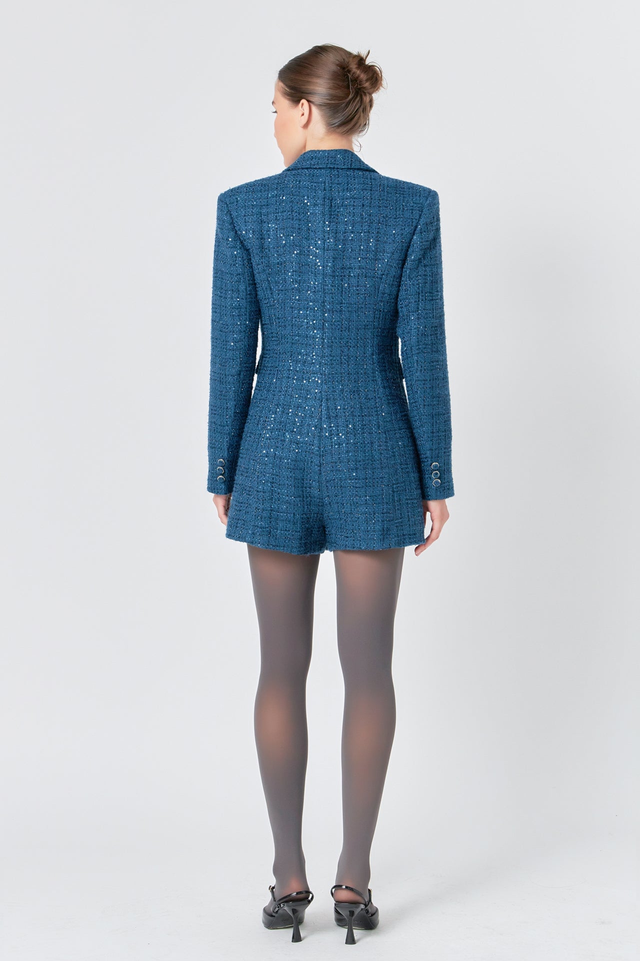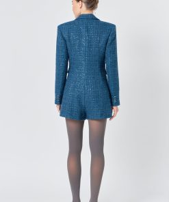 Made with sequin tweed and gold-rimmed buttons, the shoulder pads and double-breasted style of this blazer romper juxtapose the otherwise feminine piece. Fully lined for comfort, this romper also has decorative pocket flaps, princess seams, and a lapel collar.