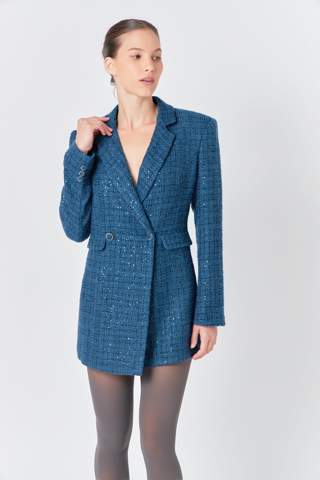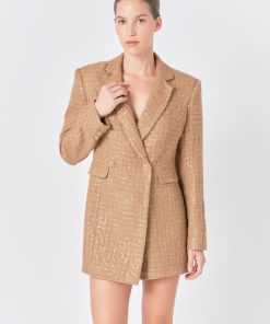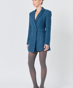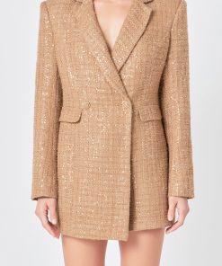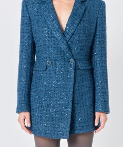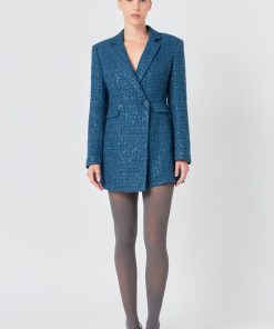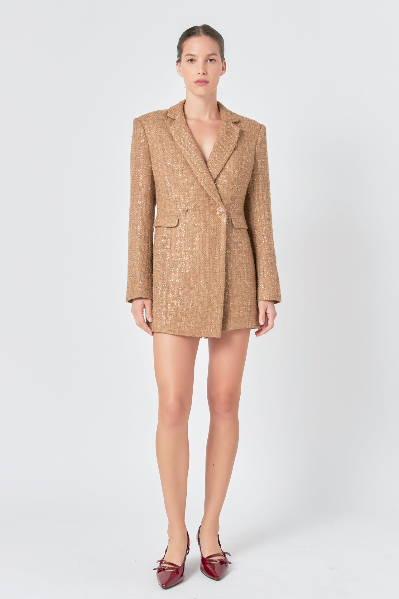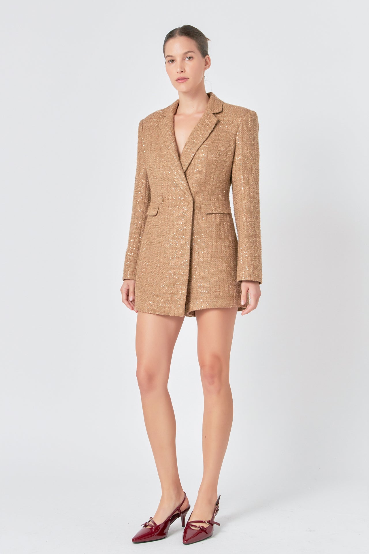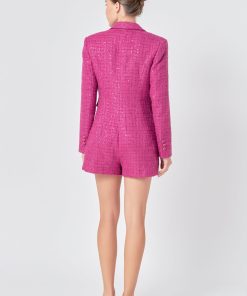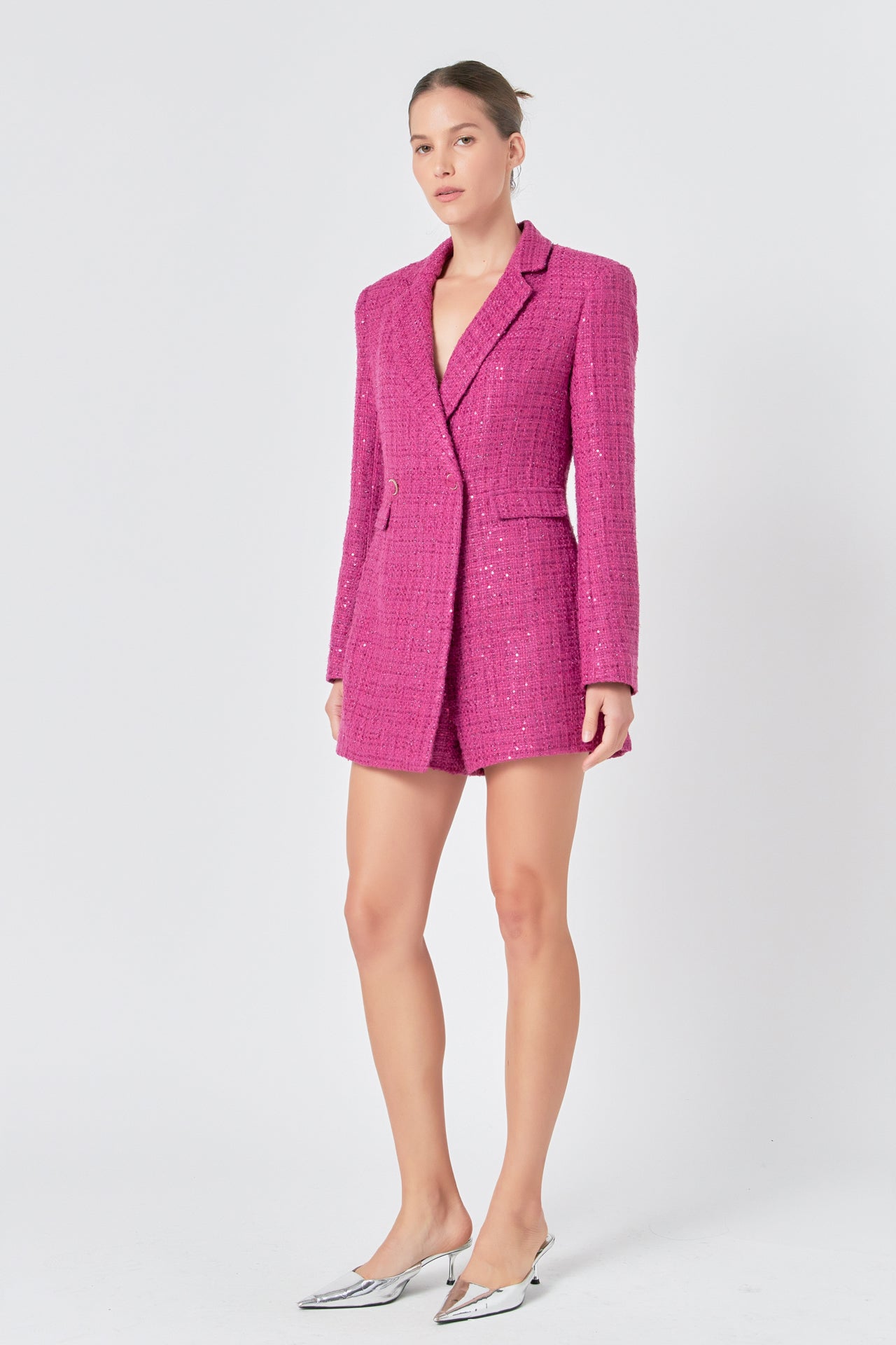 Made with sequin tweed and gold-rimmed buttons, the shoulder pads and double-breasted style of this blazer romper juxtapose the otherwise feminine piece. Fully lined for comfort, this romper also has decorative pocket flaps, princess seams, and a lapel collar.
