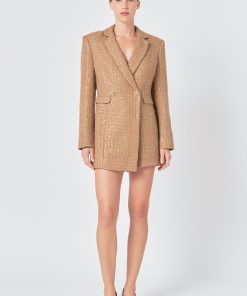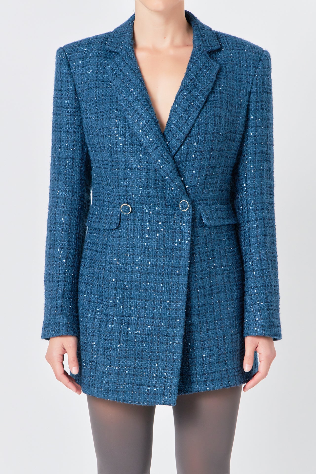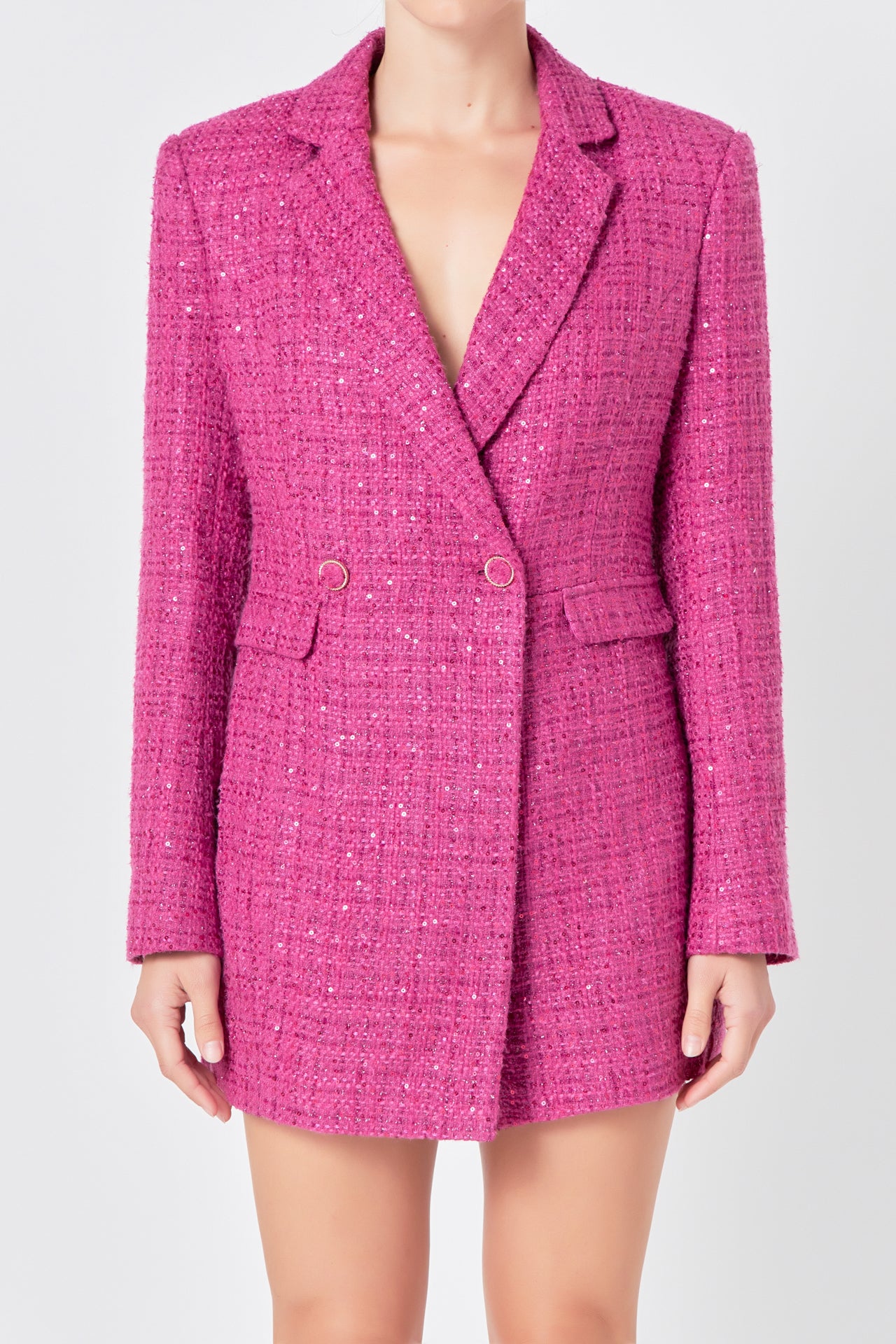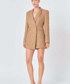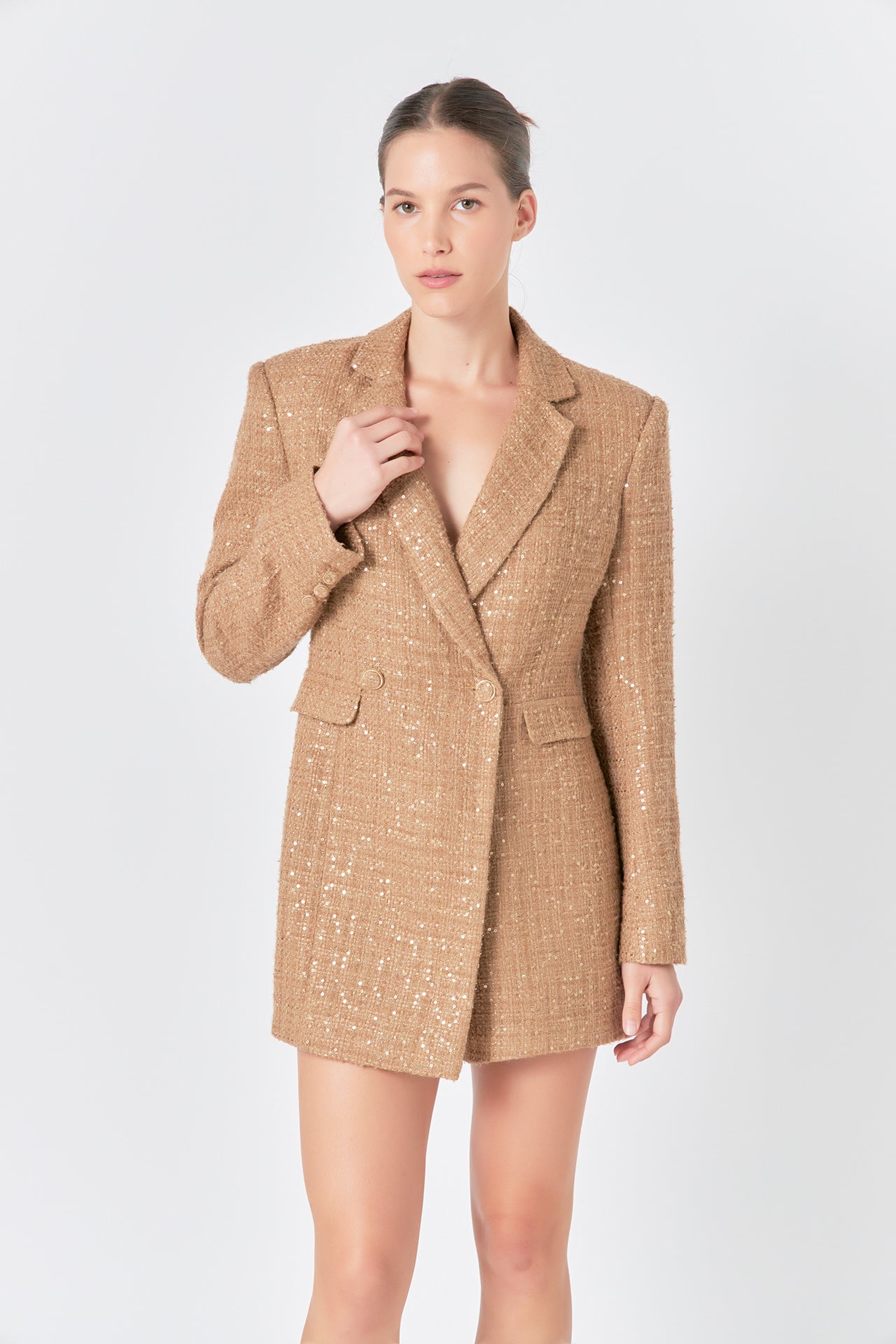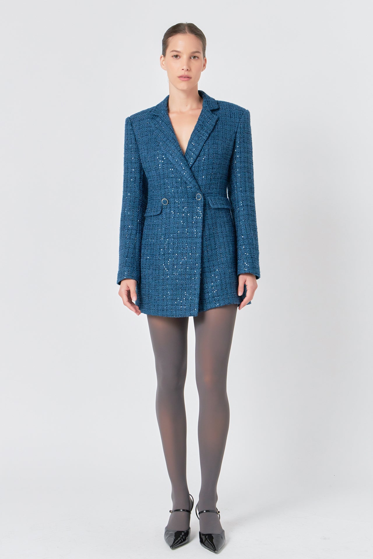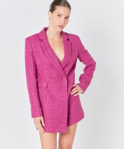 Made with sequin tweed and gold-rimmed buttons, the shoulder pads and double-breasted style of this blazer romper juxtapose the otherwise feminine piece. Fully lined for comfort, this romper also has decorative pocket flaps, princess seams, and a lapel collar.