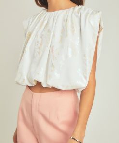 Glam up your wardrobe with our Printed Foil Sleeveless Top! Featuring a glistening foil print, this top will make you stand out from the crowd. The round neck design adds a touch of sophistication while the cropped length keeps it trendy. Made with a sleeveless design, it’s perfect for warmer days or layering with a jacket. Style it with high-waisted jeans or a skirt for a chic look. Don’t miss out on this statement piece that will elevate any outfit. Dazzle in our Printed Foil Sleeveless Top, a must-have for your closet!