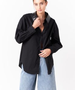 Our Pu Collared Oversize Shirt makes the perfect addition to any wardrobe! Cut with a slightly oversized fit this half-button-up shirt features a PU collar and structured seams for a timeless look. Crafted with premium materials this shirt is designed to last. Make a stunning wardrobe statement with our Pu Collared Oversize Shirt!