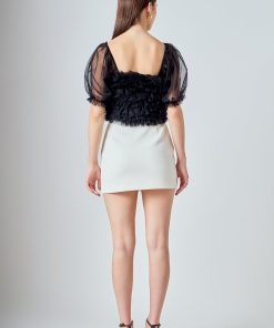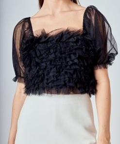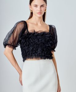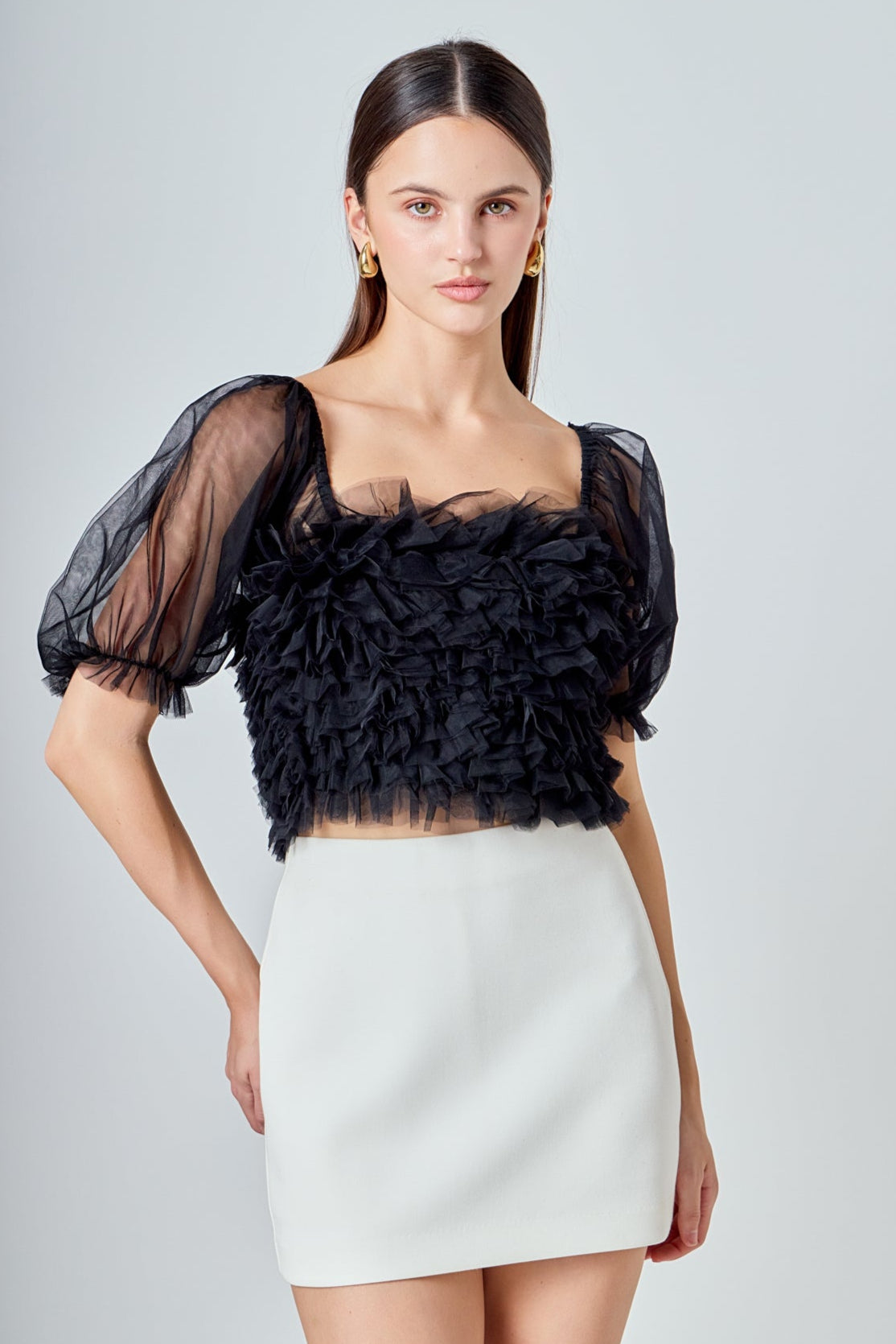 This elegant Ruffled Puff Sleeve Tulle Top features a square neckline for a sophisticated look. Crafted with ruffled short puff sleeves this cropped length top will be sure to make any ensemble shine. Its airy silhouette makes this top perfect for any special occasion.
