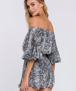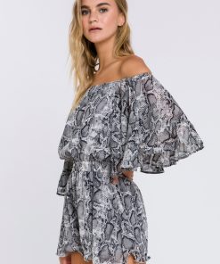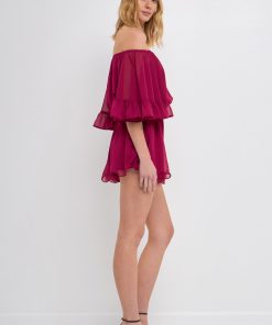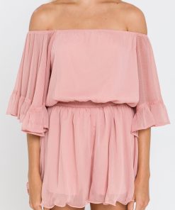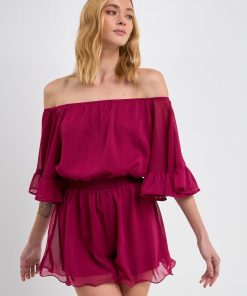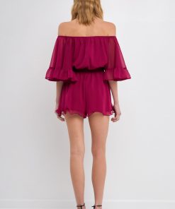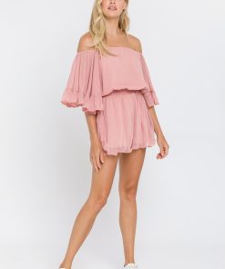 This ruffled sleeve romper is perfect for a day of fun in the sun. The off-the-shoulder silhouette and ruffle sleeves add a touch of femininity to this casual piece. The elastic at the waist ensures a comfortable and flattering fit. Made from a solid chiffon fabrication this romper is sure to become your new go-to piece for any casual occasion.