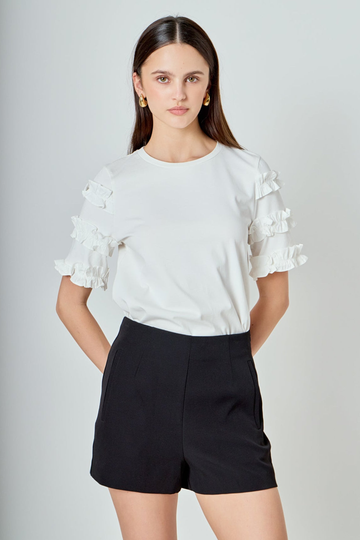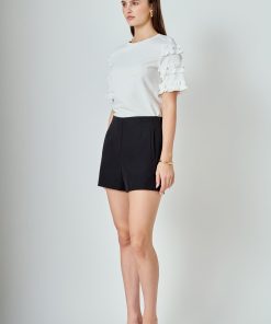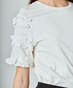 Introducing our must-have Ruffled Sleeve T-Shirt for the fashion-forward! Made with a soft knit fabric, this tee boasts a trendy ruffle contrast that’s perfect for elevating any outfit. The round neckline and short sleeves make it versatile for all seasons. Perfect for a day out or a casual night in, this top is a staple for any wardrobe. Grab yours now to add a touch of flair to your style. Stay ahead of the fashion game with our Ruffled Sleeve T-Shirt!