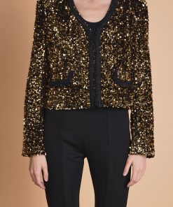 Sparkle up your wardrobe with our stunning Sequin Jacket! This eye-catching jacket features dazzling sequins, adding a touch of glamour to any outfit. With elevated shoulder pads and long sleeves, it adds structure and sophistication. The tape trim details along the edges add a touch of modernity to this classic piece. Perfect for any occasion, our Sequin Jacket is a must-have for your wardrobe. Shine bright and stand out from the crowd with this statement piece.