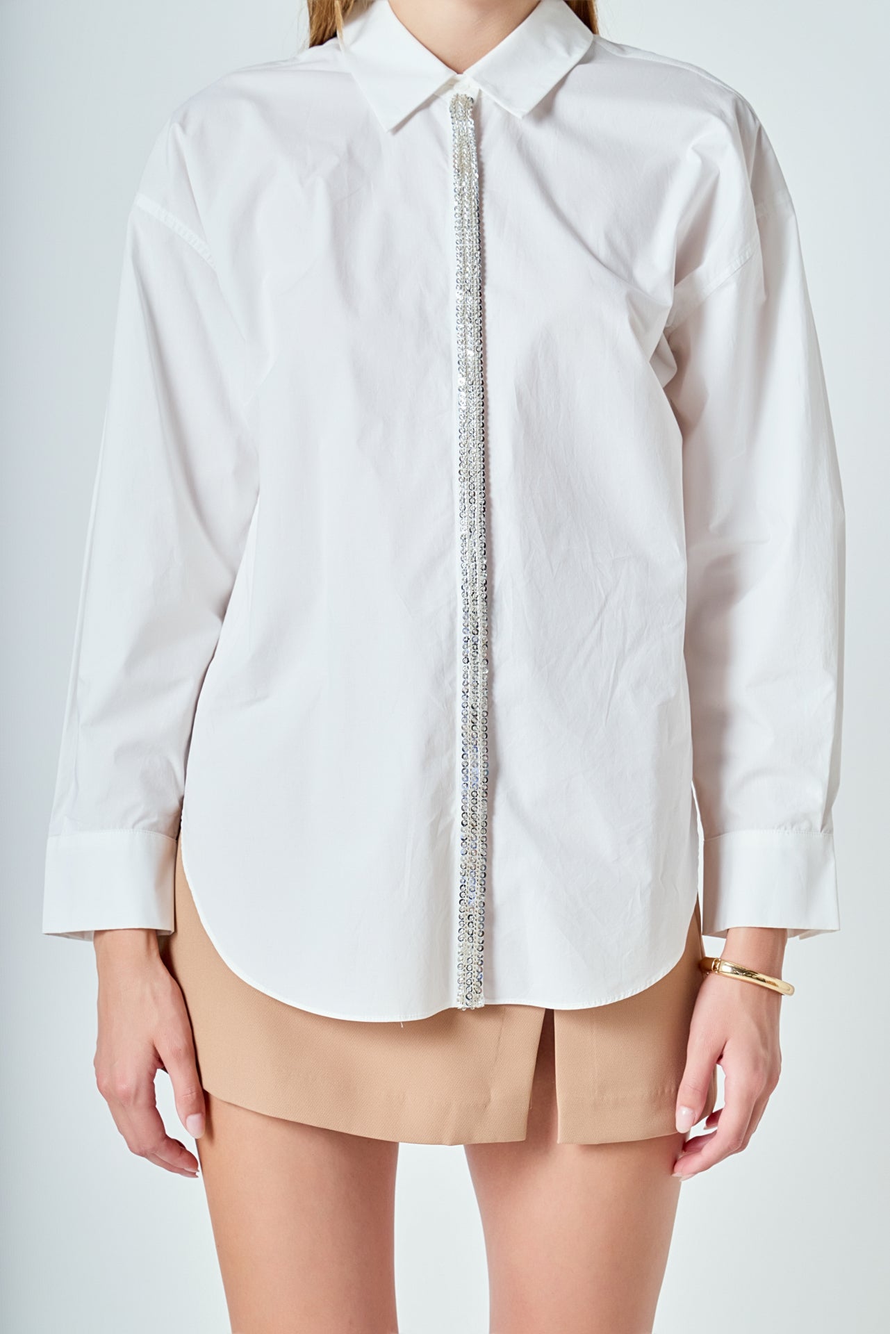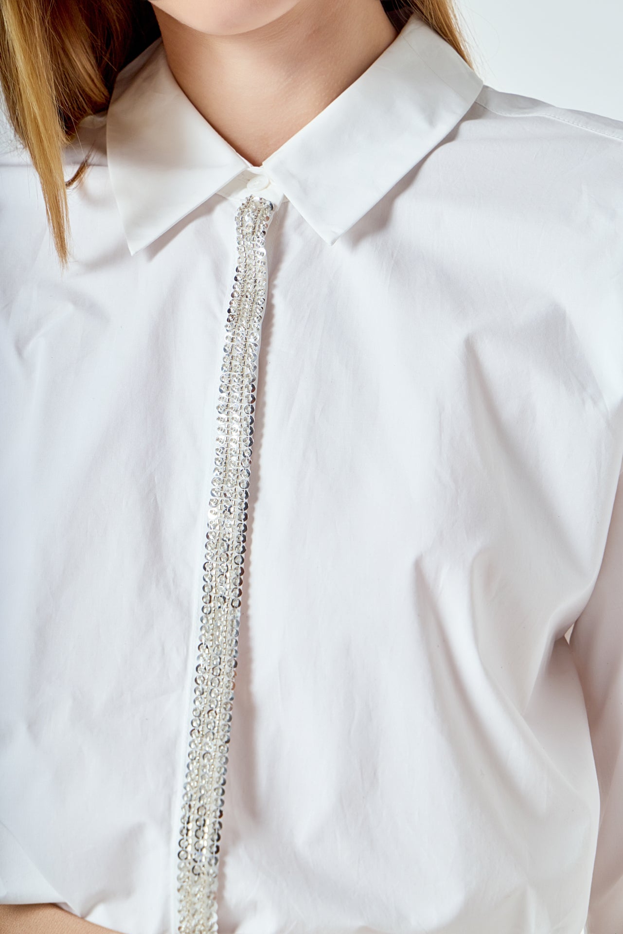 Crafted from airy, lightweight cotton, this button-up shirt offers a perfect balance of comfort and polish. Designed with a slightly oversized fit, it drapes effortlessly on the body for a relaxed yet refined silhouette. The standout detail is the placket, intricately adorned with shimmering sequins and delicate beadwork, adding a subtle touch of glamour to this classic piece. Easy to style and endlessly versatile, this shirt can be worn tucked into tailored trousers for an elevated look or left loose over denim for a chic, effortless vibe. A wardrobe essential with a sophisticated twist.