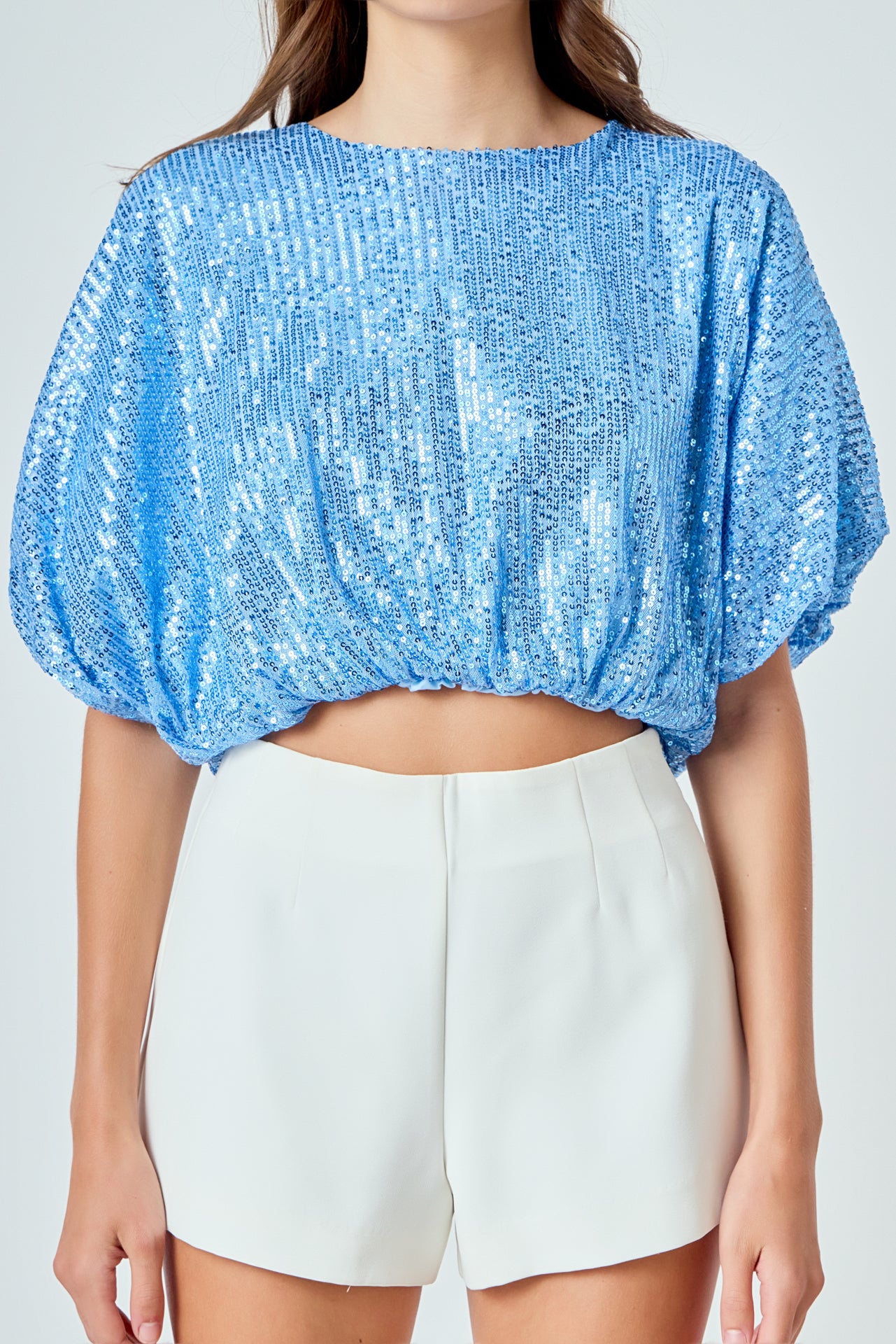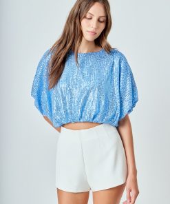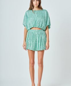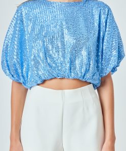 Endless Rose Women’s Sequins Cropped Puff Top | Green|blue|black|ivory|pink