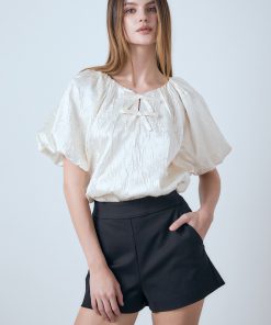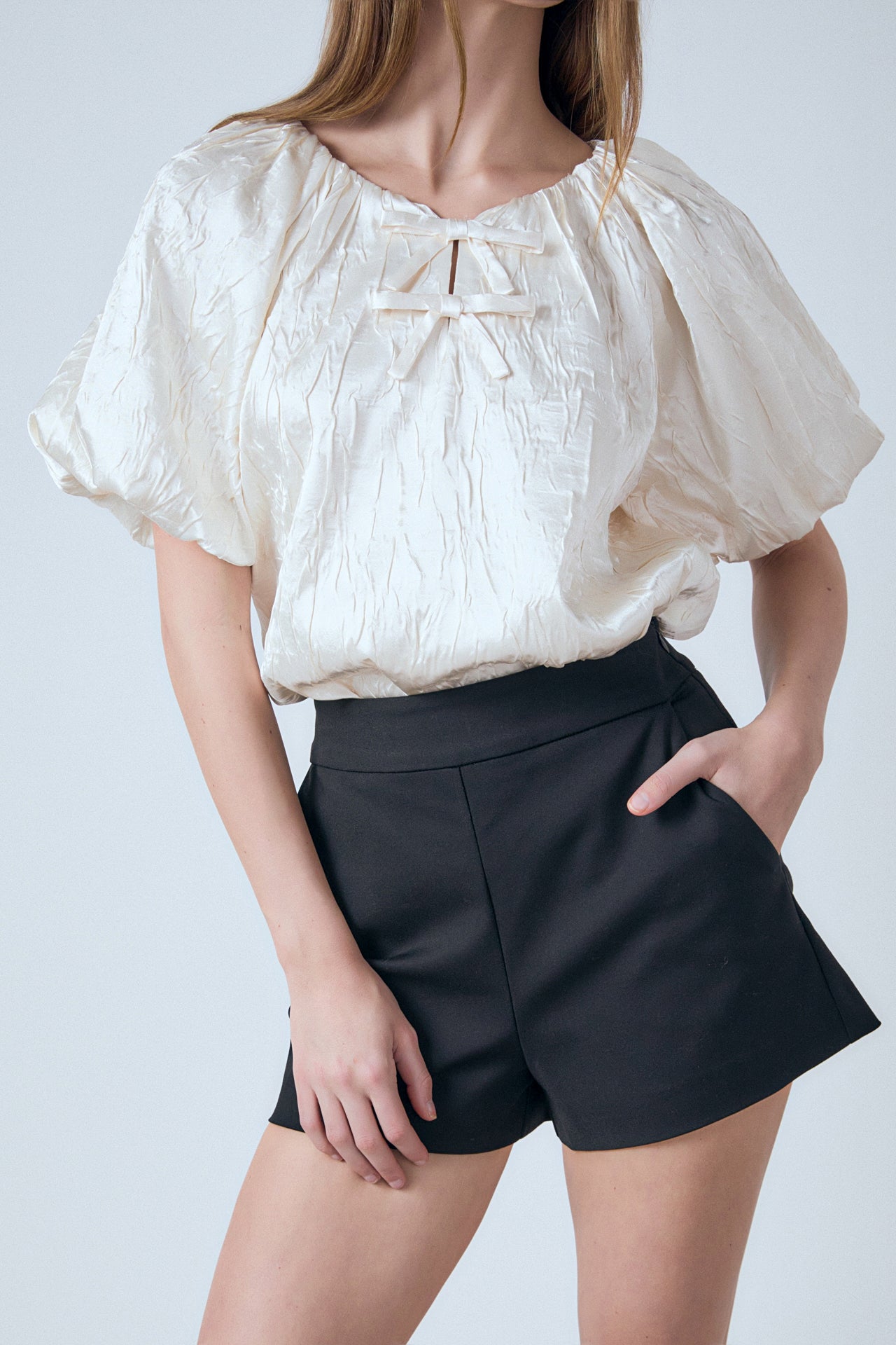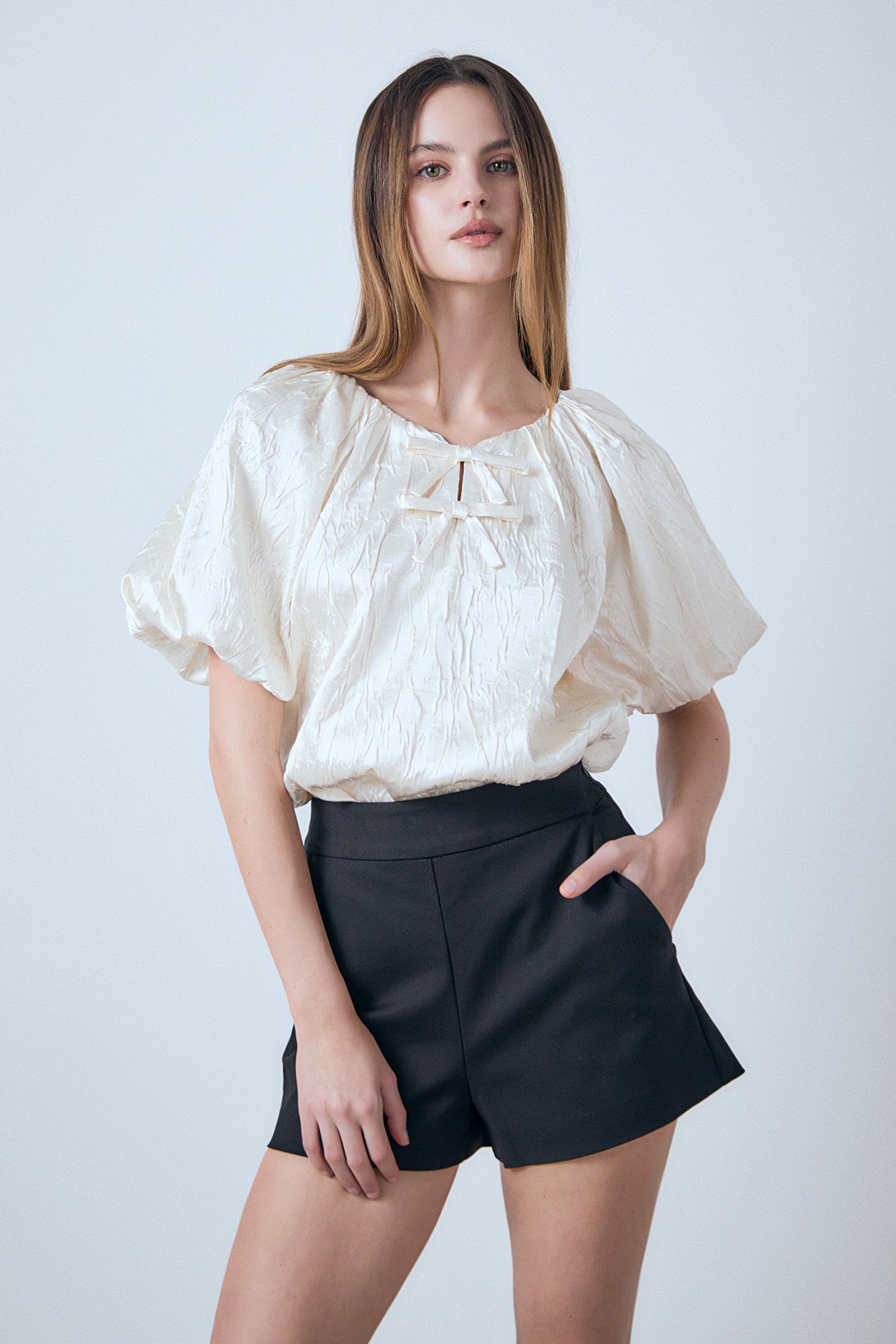 This Sheen Crinkle Bow Detail Top is the perfect stylish addition to your wardrobe! Made of textured sheen fabric it features a loose fit and round neckline as well as a unique blouson sleeve design and bow detail. With this modern and stylish top you are sure to make a statement wherever you go. Comfort and fashion come together in this top making it a must-have for any fashionista!