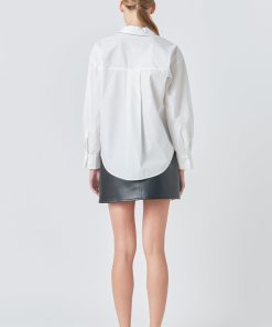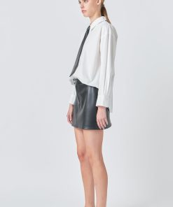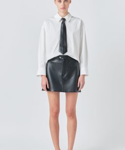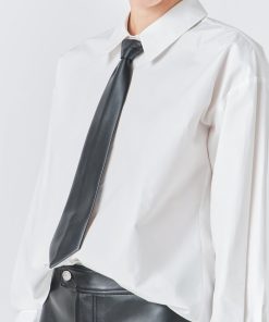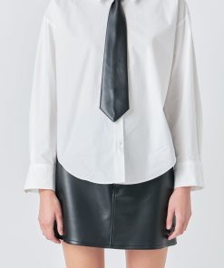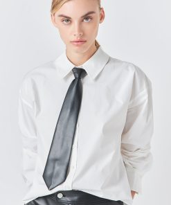 Introducing our stylish Shirt with Faux Leather Necktie the top you need to elevate your wardrobe game! This versatile piece features a trendy and eye-catching necktie made of faux leather adding a touch of edginess to your overall look. The front button down and long sleeves give it a classic and timeless appeal while the collared design adds a touch of sophistication. This shirt is perfect for any occasion whether it’s a day at the office or a night out on the town. Get ready to turn heads and make a bold fashion statement with our Shirt with Faux Leather Necktie. Shop now and upgrade your style