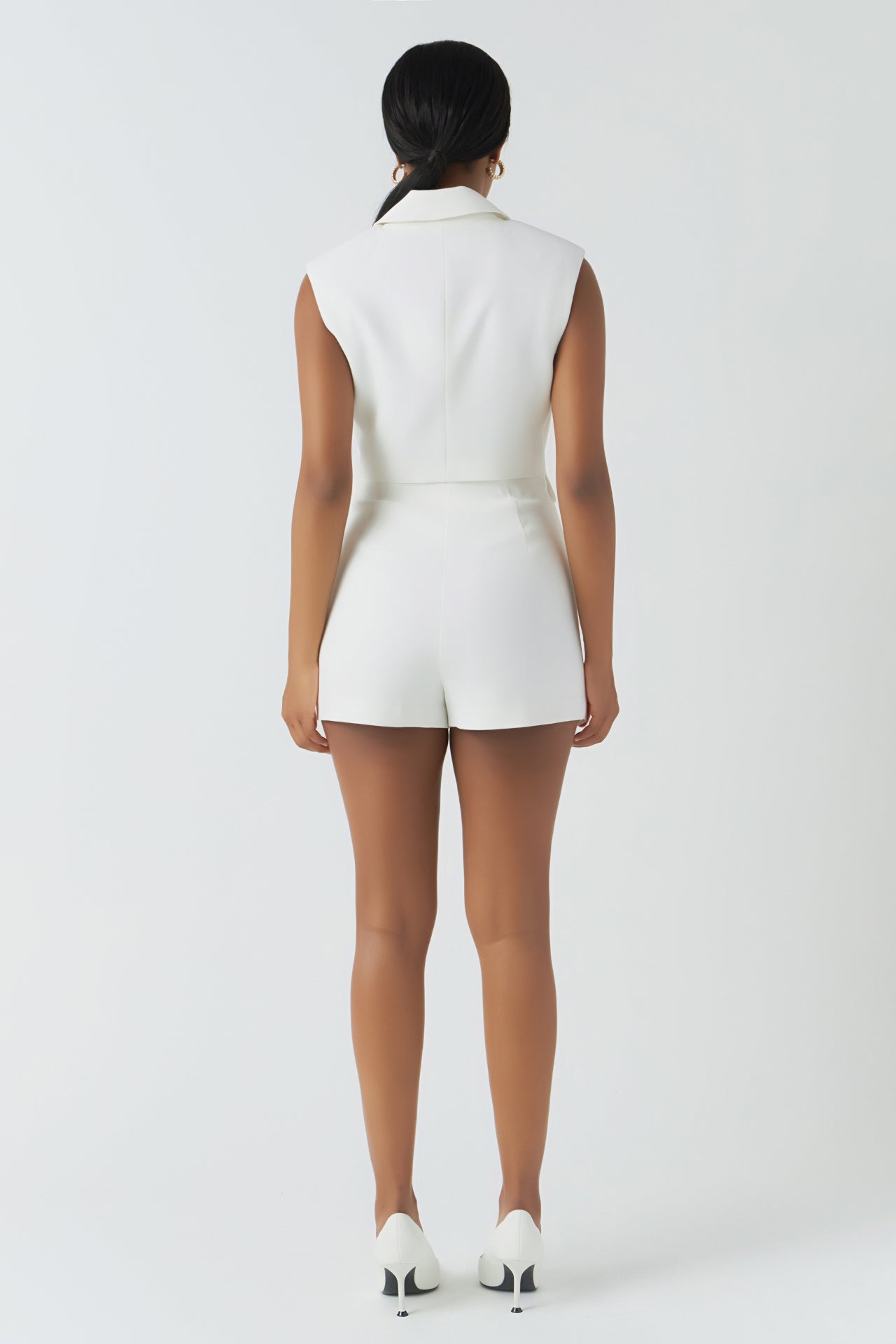 Make a statement with this stylish Sleeveless Blazer Romper. With the shape of a blazer but the convenience of a romper, you’ll achieve sharp sophistication with this look. Padded shoulders and welt flaps accentuate your silhouette, while gold buttons add a touch of glamor. An open back completes the look, making it perfect for any occasion. Say hello to power dressing with a modern edge – no blazer required!